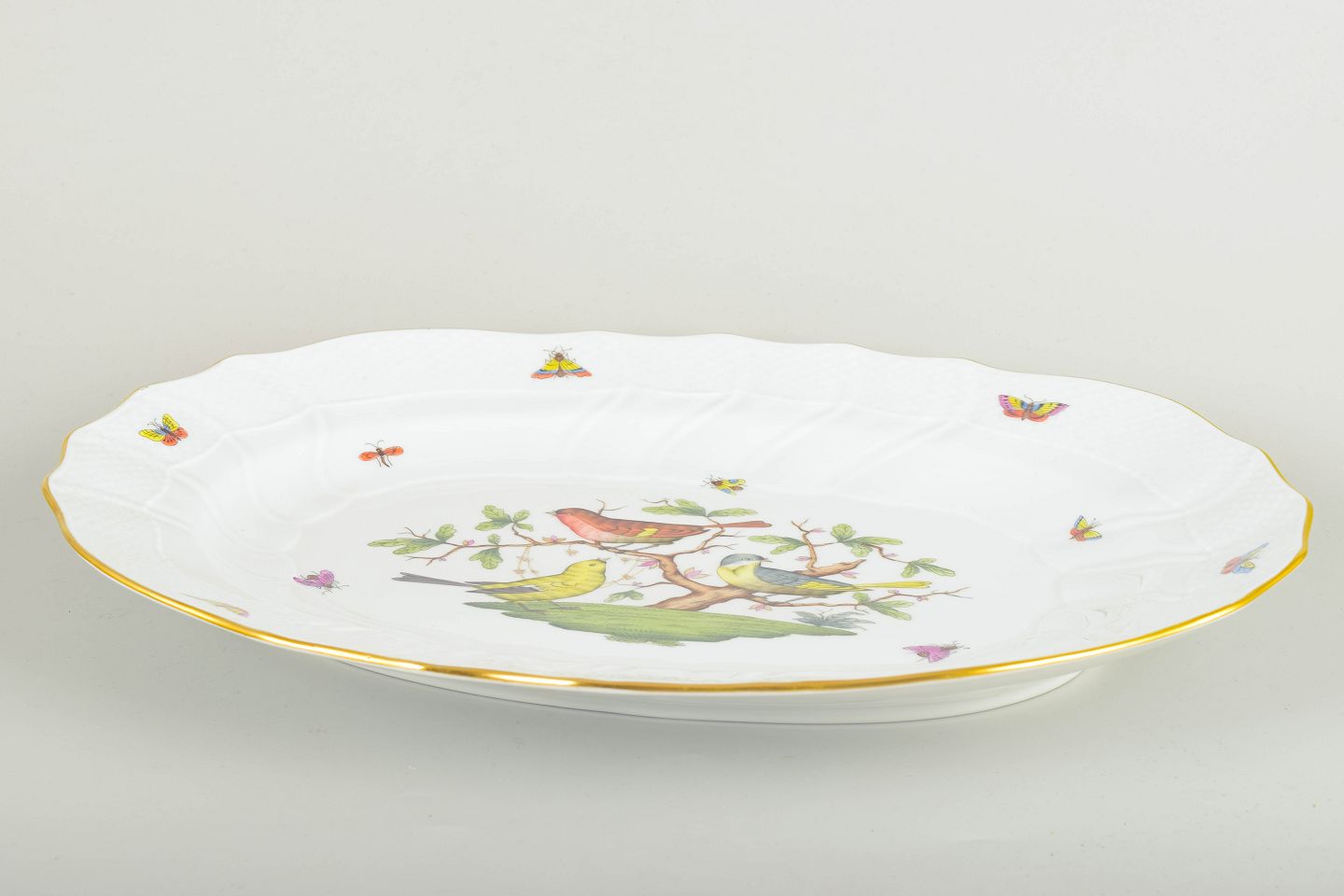 Stort ovalt serveringsfad i håndmalet porcelæn med motiv af fugle på gren og sommerfugle, kantet med forgyldt rand. Klassisk Herend-dekoration i fine farver og detaljeret penselføring.