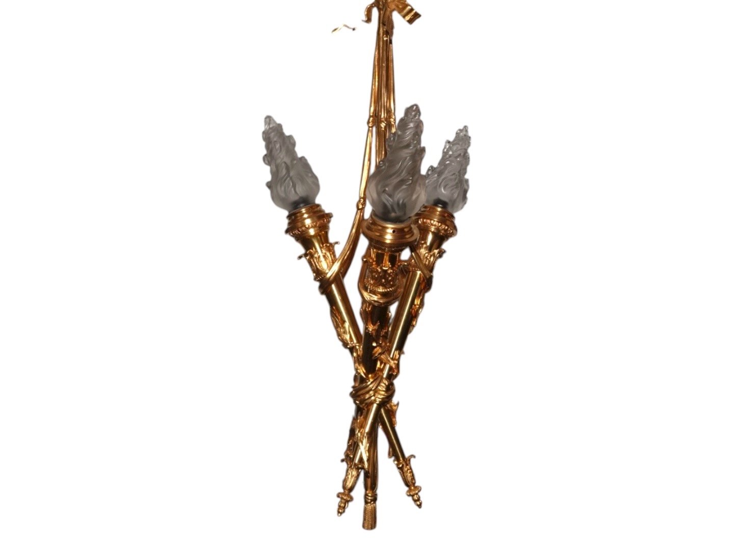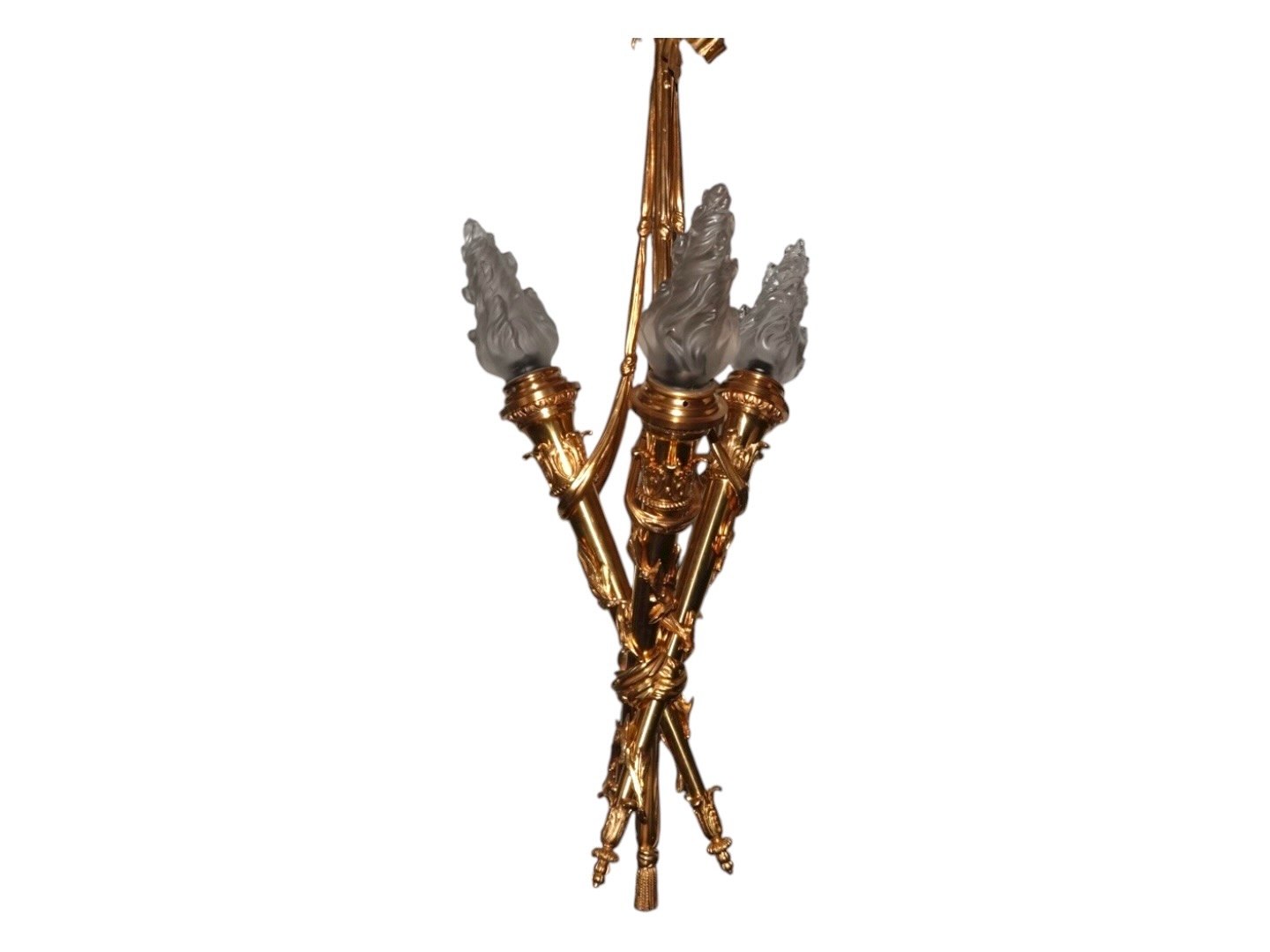Smal lysekrone i empire stil. Den er i massiv forgyldt bronze med tre fakler og er udført i en lækker, tung kvalitet.Højde 80,0 cm., bredde 30,0 cm.