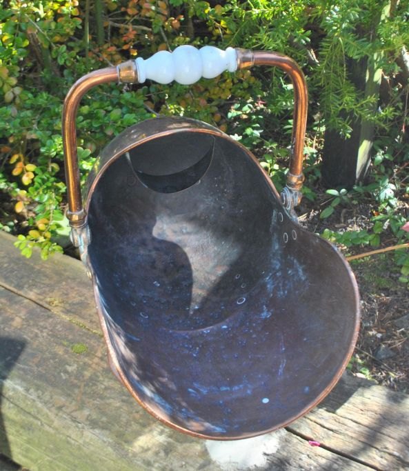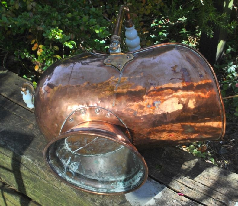 Antiker Kohleneimer aus Kupfer, 19. Jahrhundert. Auf rundem Fuß. Mit Griffen aus weißem Opalglas. L: 49 cm. H: 33 cm. Höhe mit Griffen: 47 cm.Super Zustand!