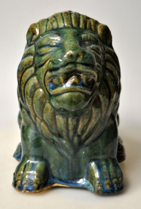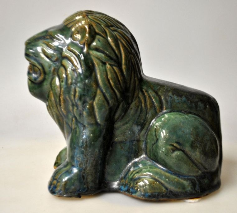 Keramischer Löwe, China. 19. Jahrhundert. Mit grün-bläulicher Glasur. Höhe: 19 cm.Bestellnummer: 28479