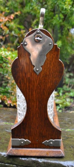 Englischer Tantalus mit drei Kristallkaraffen, 19. Jahrhundert. Polierte Eiche. Mit Messingbeschlägen und Schloss mit Schlüssel. Höhe: 32,5 cm. Länge: 35 cm.Hinweis: Die Karaffen weisen einige Absplitterungen auf.