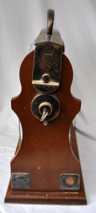 Englischer Tantalus mit zwei Kristallkaraffen, 19. Jahrhundert. Mit Metallbeschlägen und Schloss mit Schlüssel. Gestempelt. Höhe: 32 cm. Länge: 27 cm.Bestellnummer: 28481