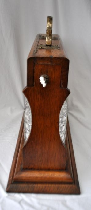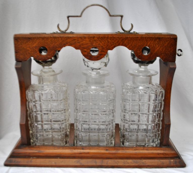 Englischer Tantalus mit drei Kristallkaraffen, 19. Jahrhundert. Eiche. Mit Messingbeschlägen und Schloss mit Schlüssel. Höhe: 33 cm. Länge: 37 cm.Bestellnummer: 28482