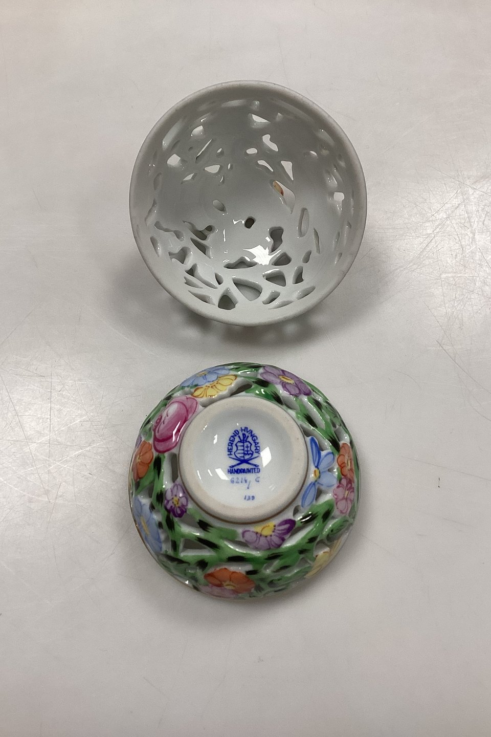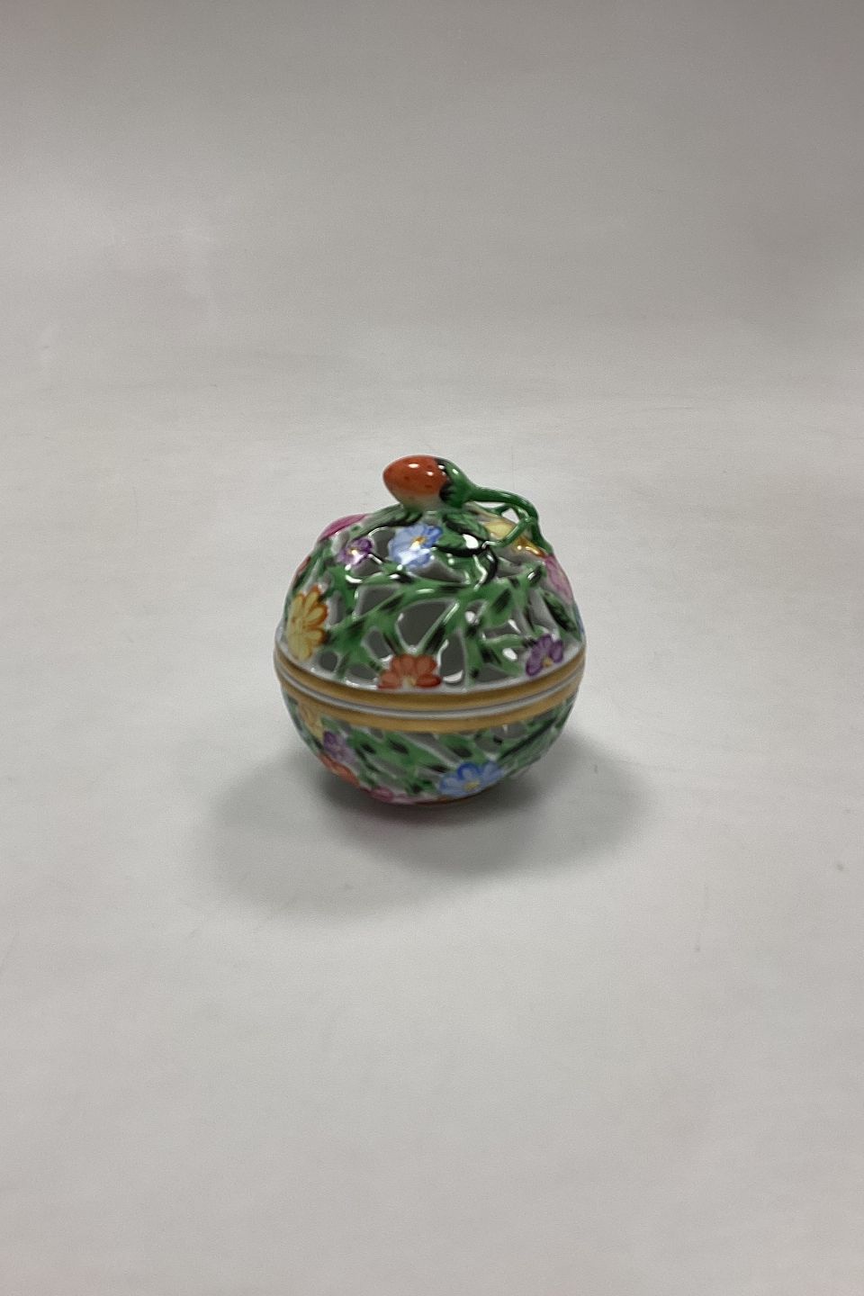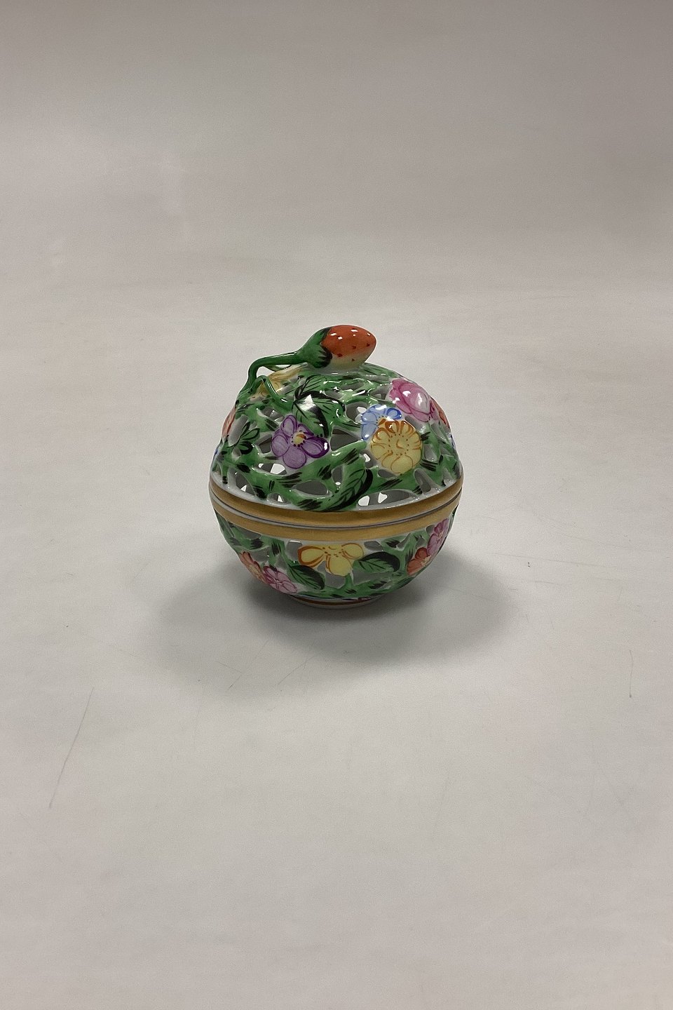 Herend Ungarn Bonbonniere, gennembrudt No. 6214. Multifarvet med blomster.Måler: H 7,7 cm x D 7 cm.