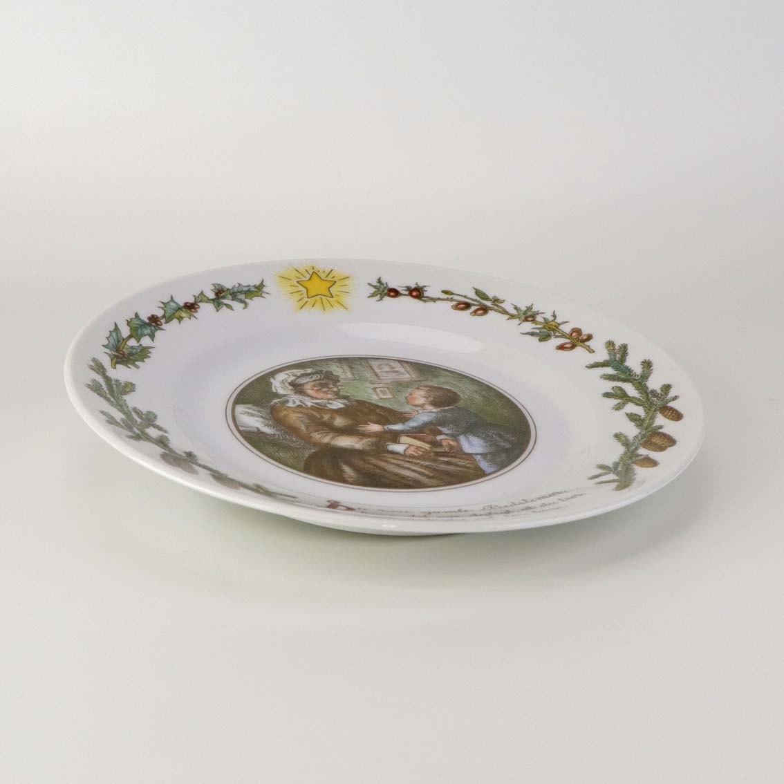Flad desserttallerken i kongeligt porcelæn fra serien Peters Jul med motiv af bedstemor. Nr. 5Formgiver Johan Krohn og Pietro Krohn