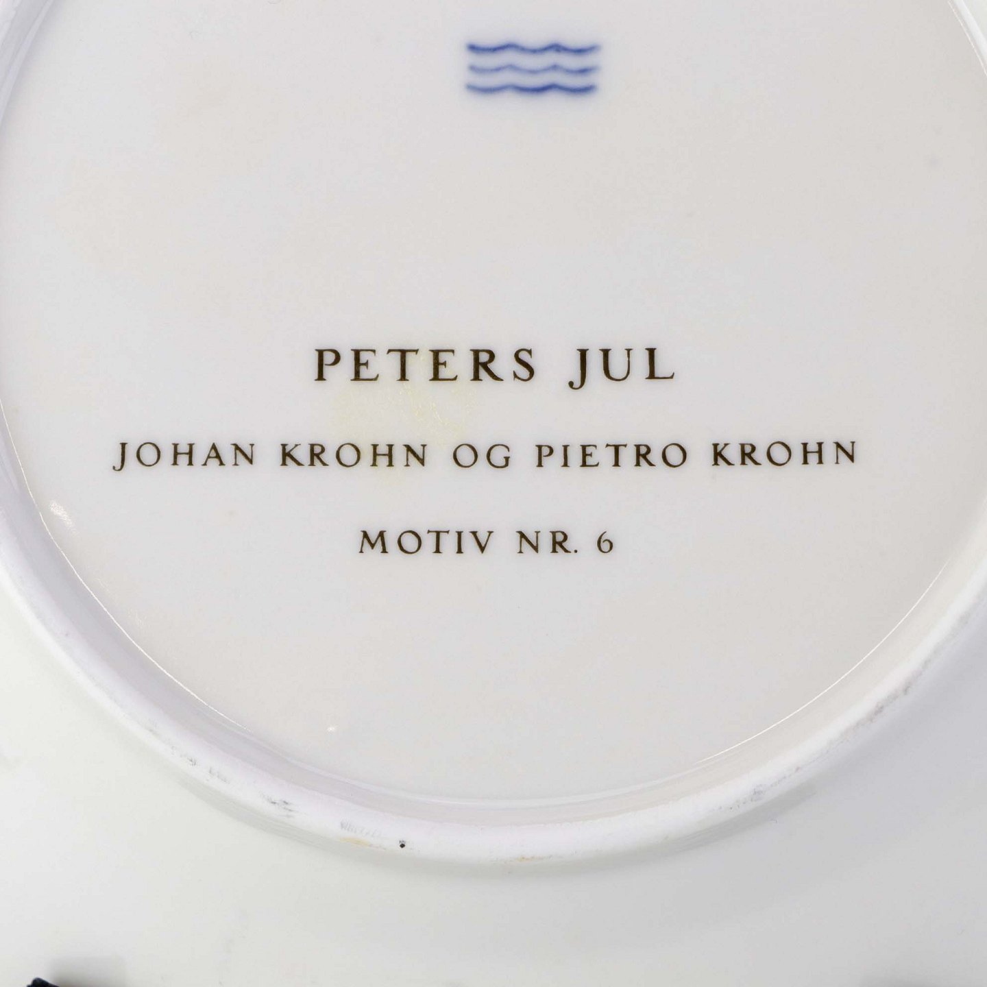 Flad desserttallerken i kongeligt porcelæn fra serien Peters Jul med motiv af julebordet med familien. Nr. 6Formgiver Johan Krohn og Pietro Krohn