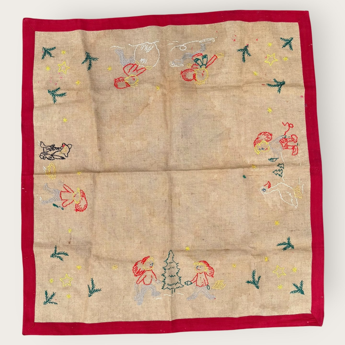 Weihnachtsbaumdecke, Stickerei mit Weihnachtsmotiv, 100 cm / 95 cm *Schöner, patinierter Zustand*