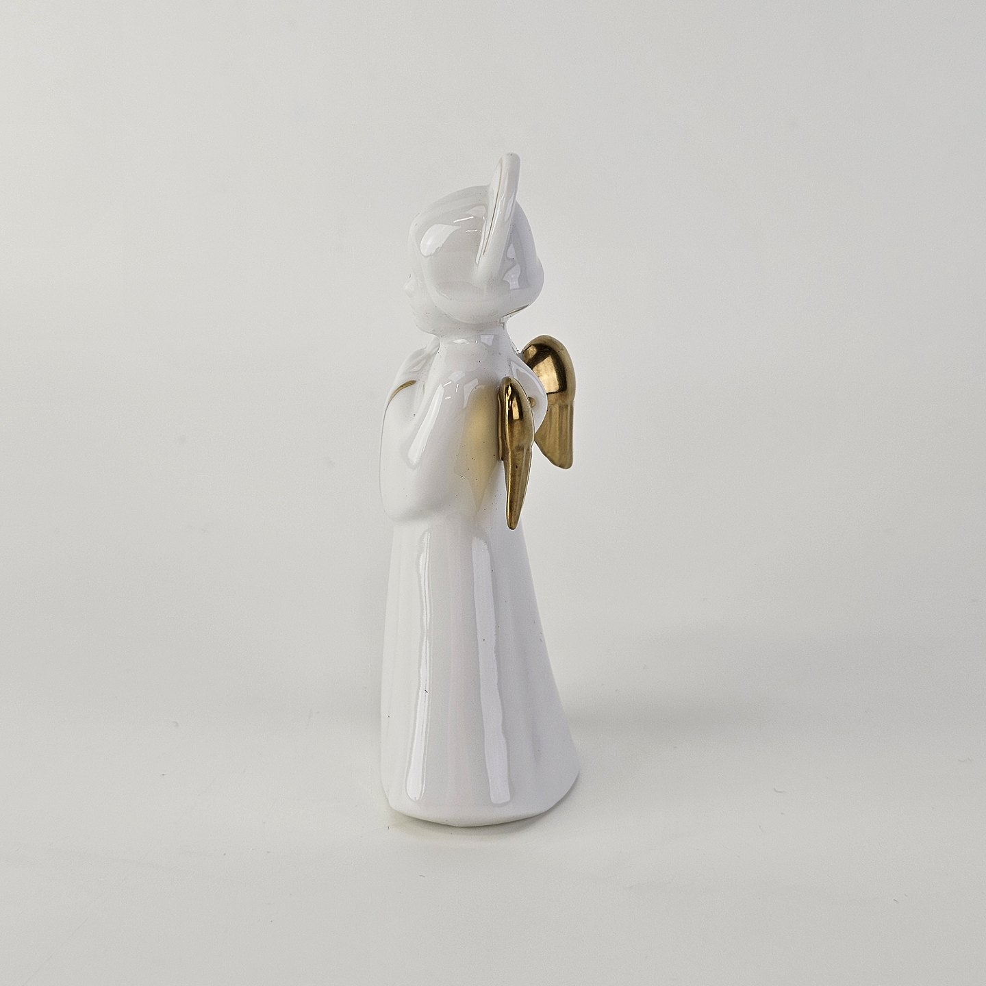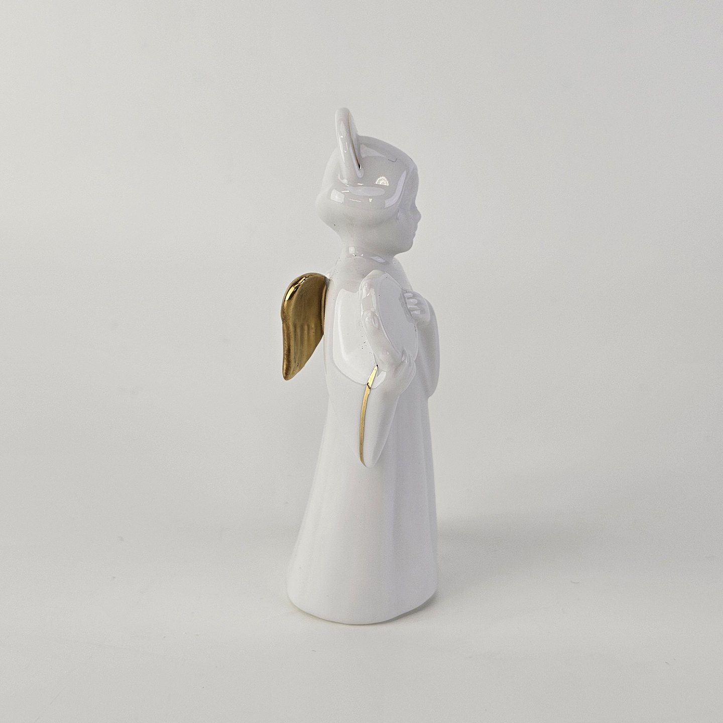 Figur med motiv af en engel med en tamburin. Figuren er i hvidt porcelæn med forgyldte vinger og detaljer i 24 karat guld.