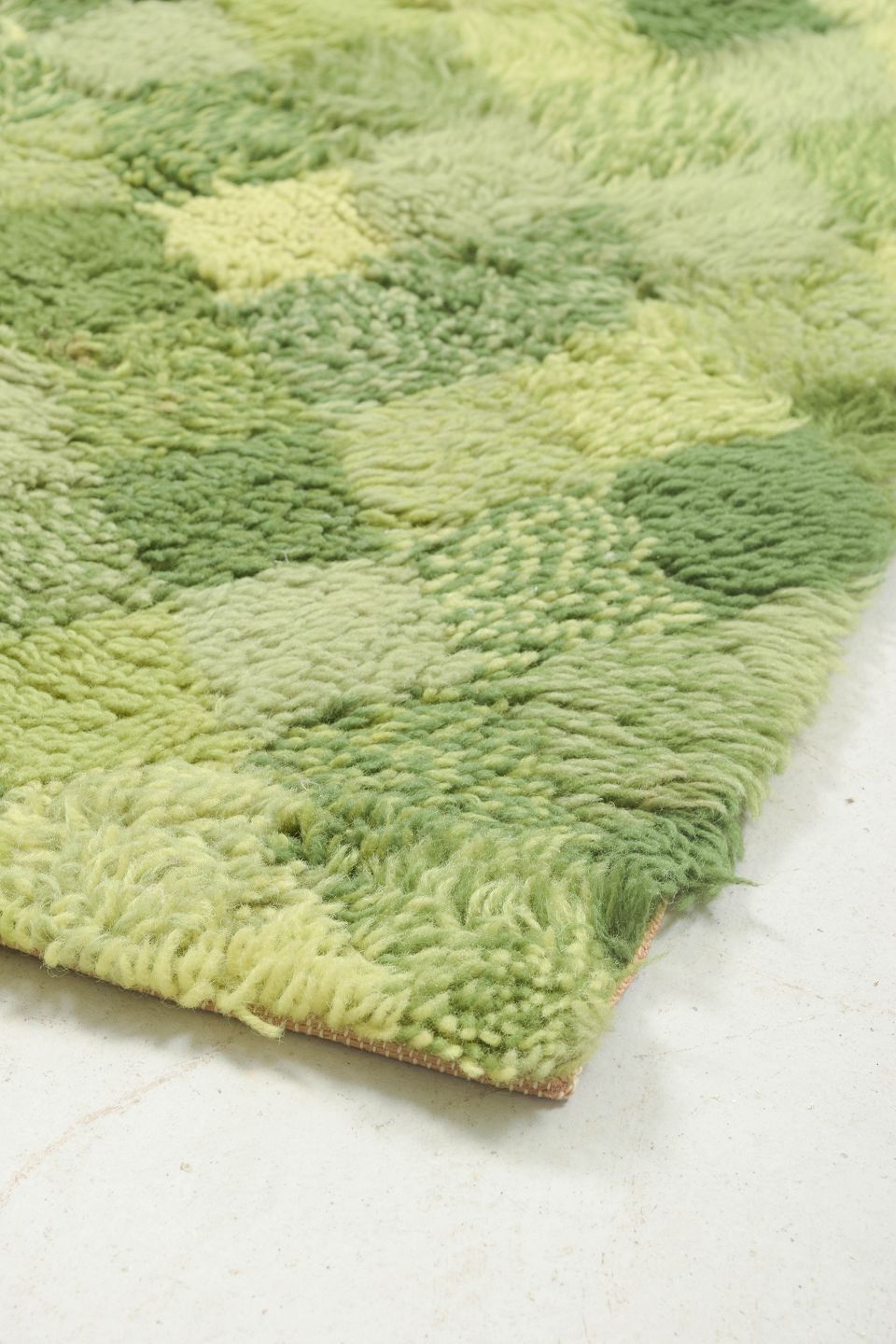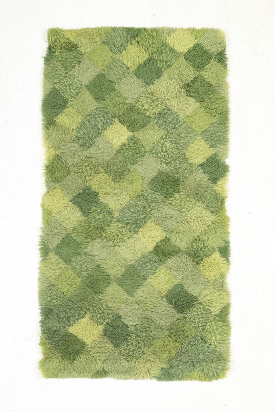 Håndknyttet rya-tæppe i uld med geometrisk ternet mønster i forskellige grønne nuancer. Et harmonisk og tidstypisk design, hvor tone-i-tone farver skaber en rolig og organisk overflade – et klassisk eksempel på skandinavisk enkelhed og sans for naturlige farver.