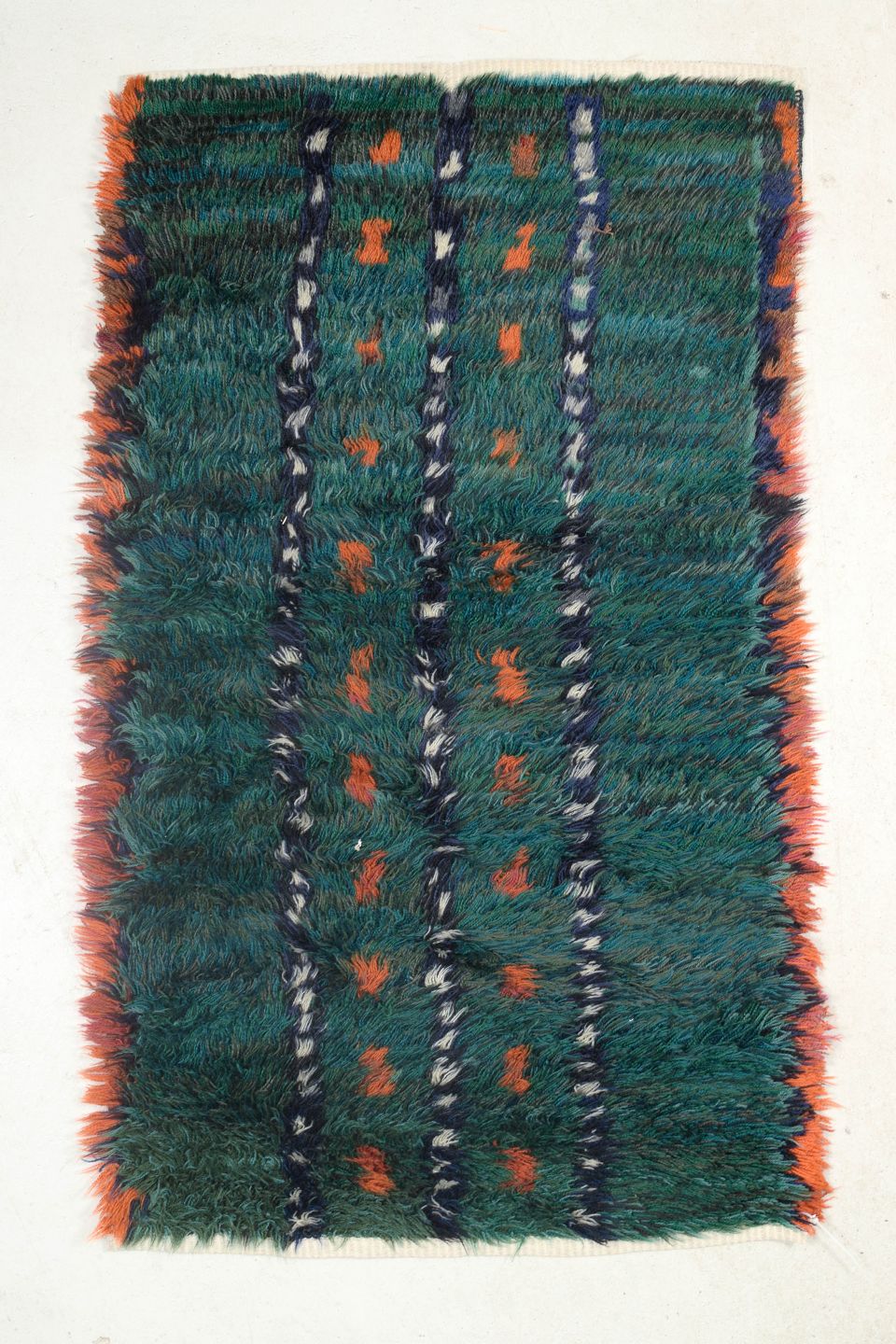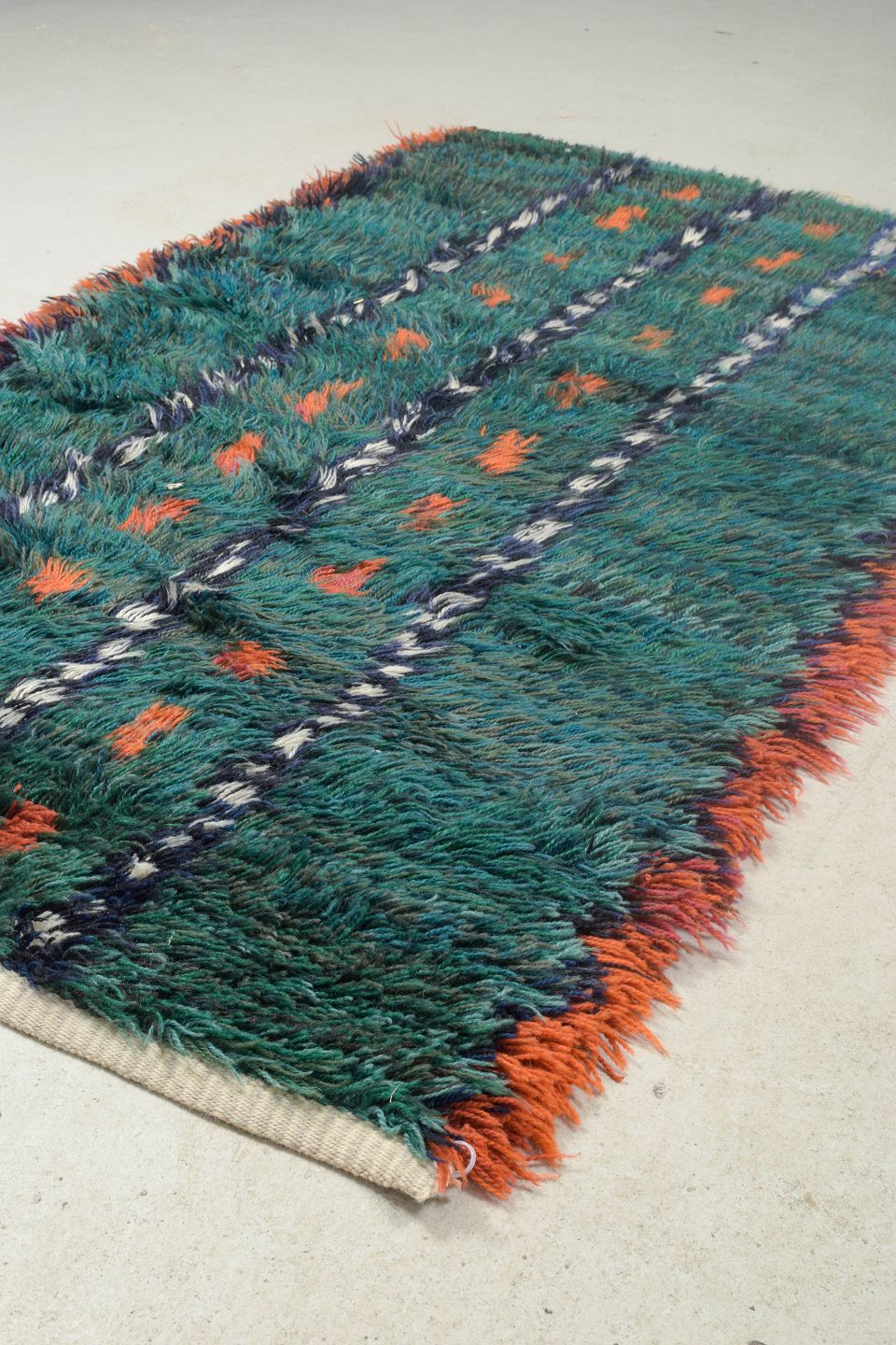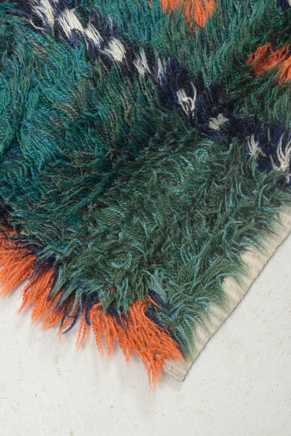 Håndknyttet rya-tæppe i uld med lodrette bånd og rytmisk mønster i grønne, blå, orange og hvide nuancer. Et farverigt og teksturelt værk, typisk for skandinavisk design i perioden, hvor eksperimenterende farvesammensætninger blev kombineret med klassisk håndværk.