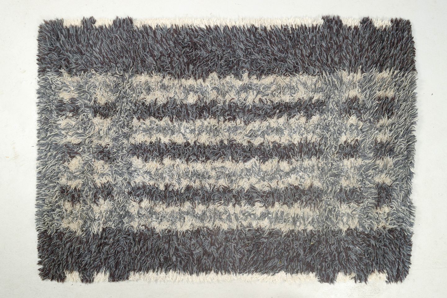 Håndknyttet rya-tæppe i uld med geometrisk mønster i grå og cremefarvede nuancer. Et klassisk eksempel på skandinavisk design fra perioden, hvor enkelhed og struktur blev kombineret med funktionel æstetik.