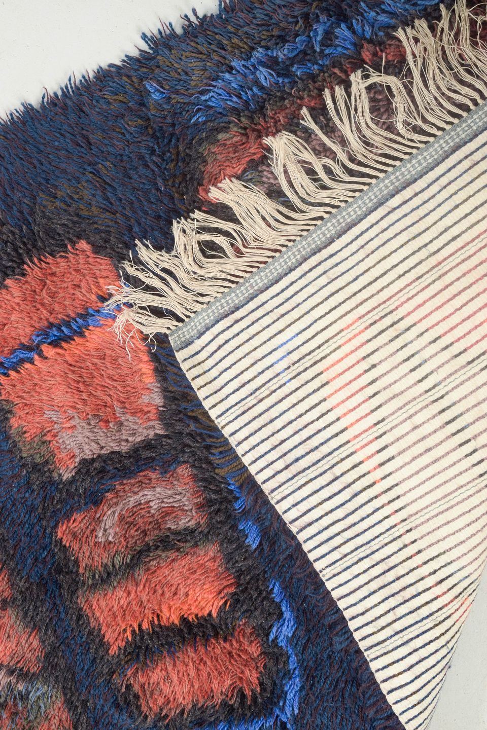 Håndknyttet rya-tæppe i ren uld med geometrisk, næsten skulpturelt mønster i varme røde, sorte og blå toner. Designet af Evy Viola Wiklund i 1967, et karakteristisk eksempel på svensk tekstilkunst fra perioden, hvor farvekontraster og organiske former var centrale elementer.
