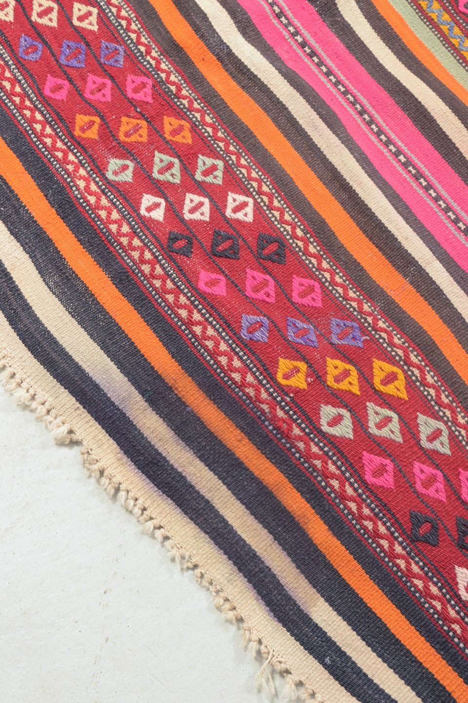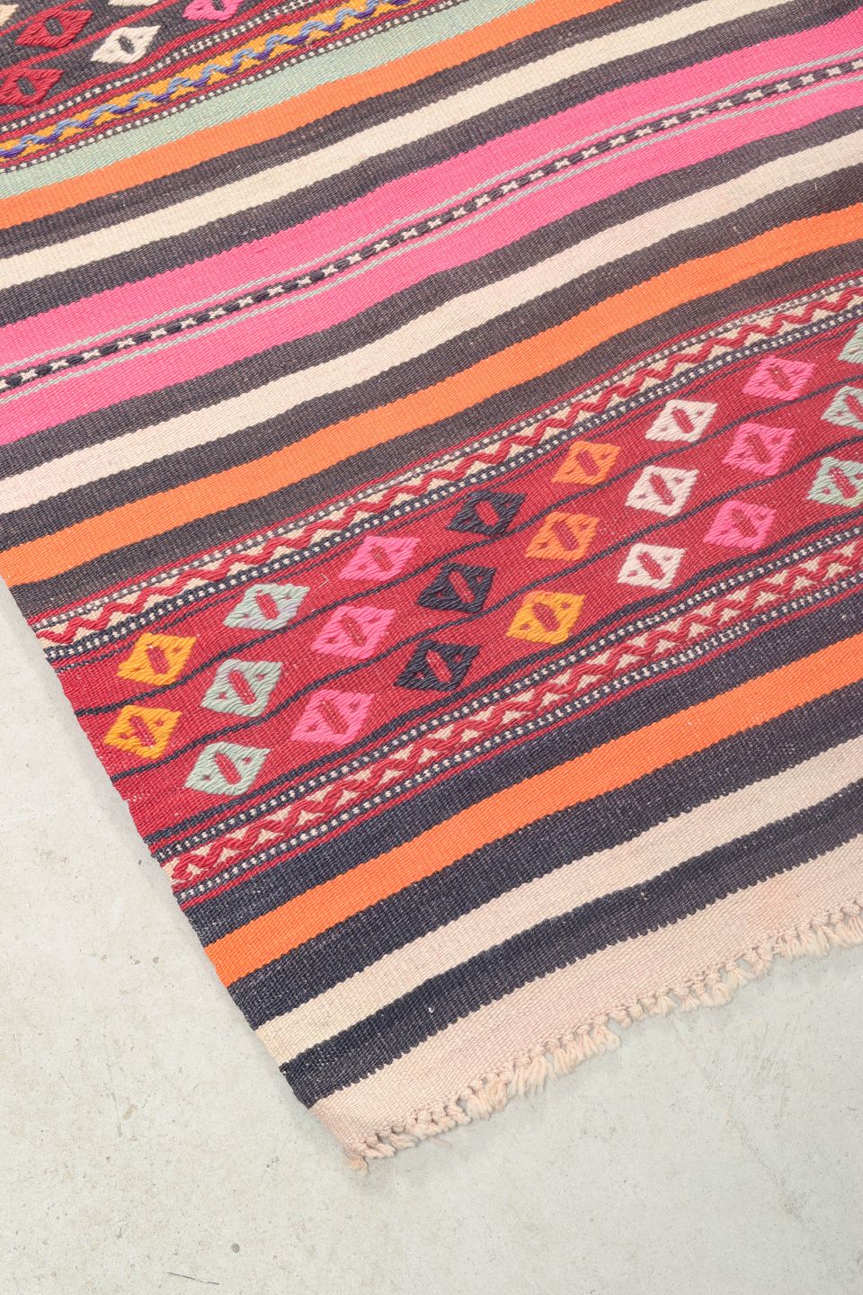 Kelim tæppe, 1960/70’erne.Håndvævet kelim tæppe i 100 % bomuld med geometrisk mønster i flerfarvede striber i røde, orange, rosa og blå nuancer. Et dekorativt vintage tekstilstykke med klassisk folkelig karakter.