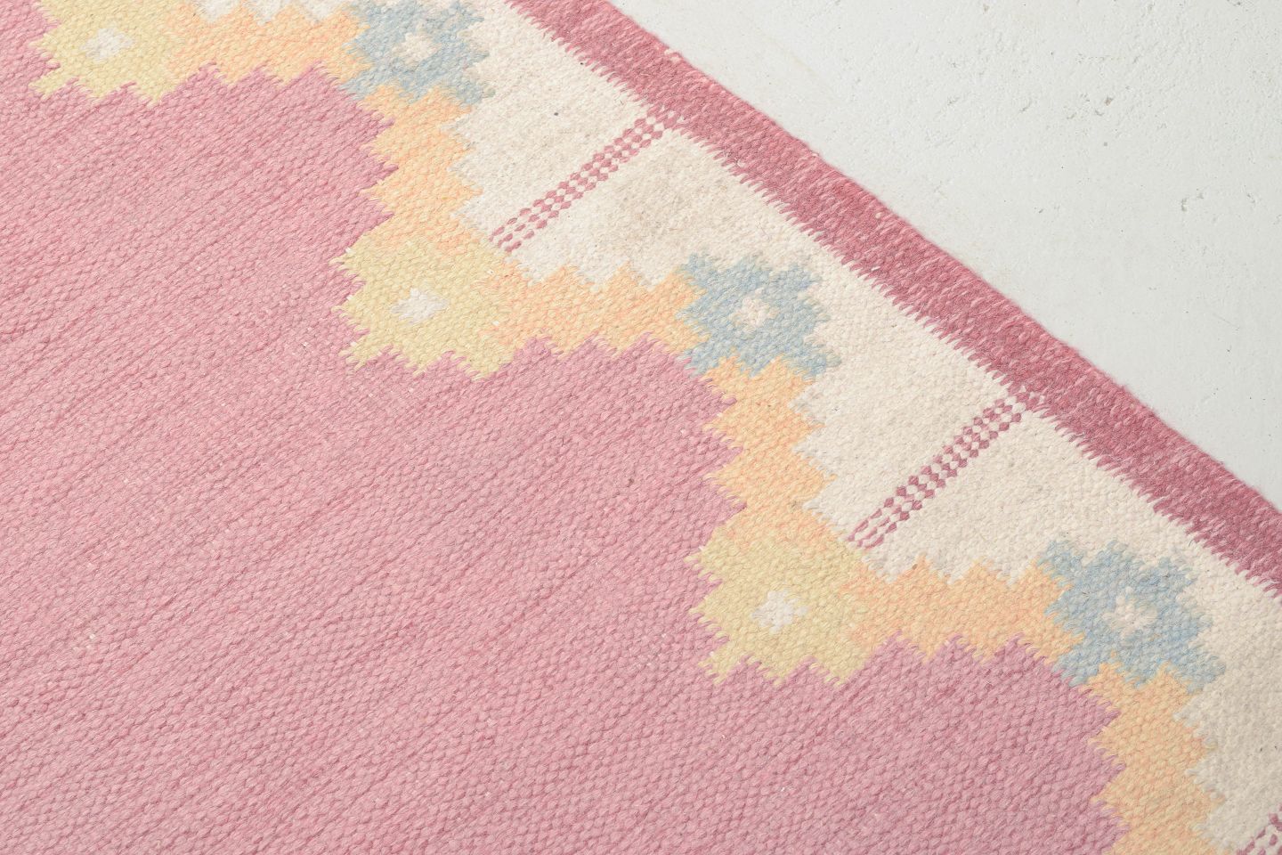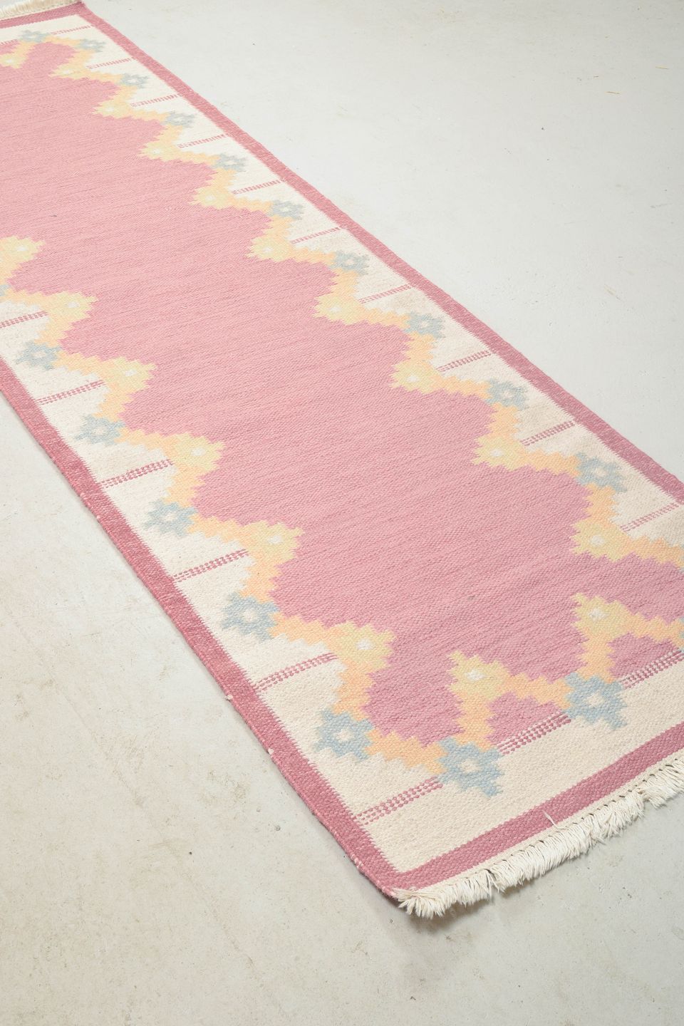 Håndvævet rölakan-løber i uld med geometrisk mønster i rosa, gule og lyseblå toner. Et dekorativt eksempel på svensk tekstilkunst fra 1960’erne, der kombinerer farverig enkelhed med klassisk fladvævning.