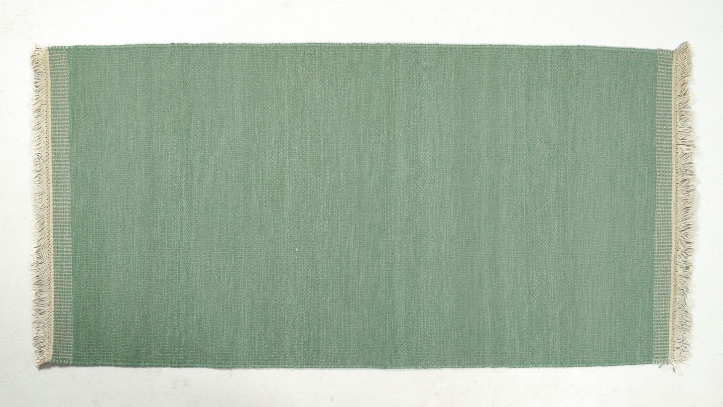 Håndvævet rölakan-tæppe i uld med ensfarvet væv i støvet grøn nuance og frynser i enderne. Et stilrent eksempel på svensk tekstiltradition, hvor enkelhed og håndværksmæssig kvalitet går hånd i hånd.