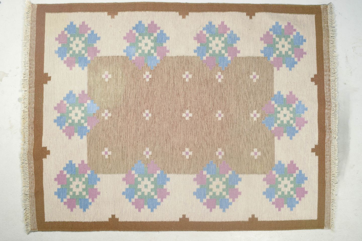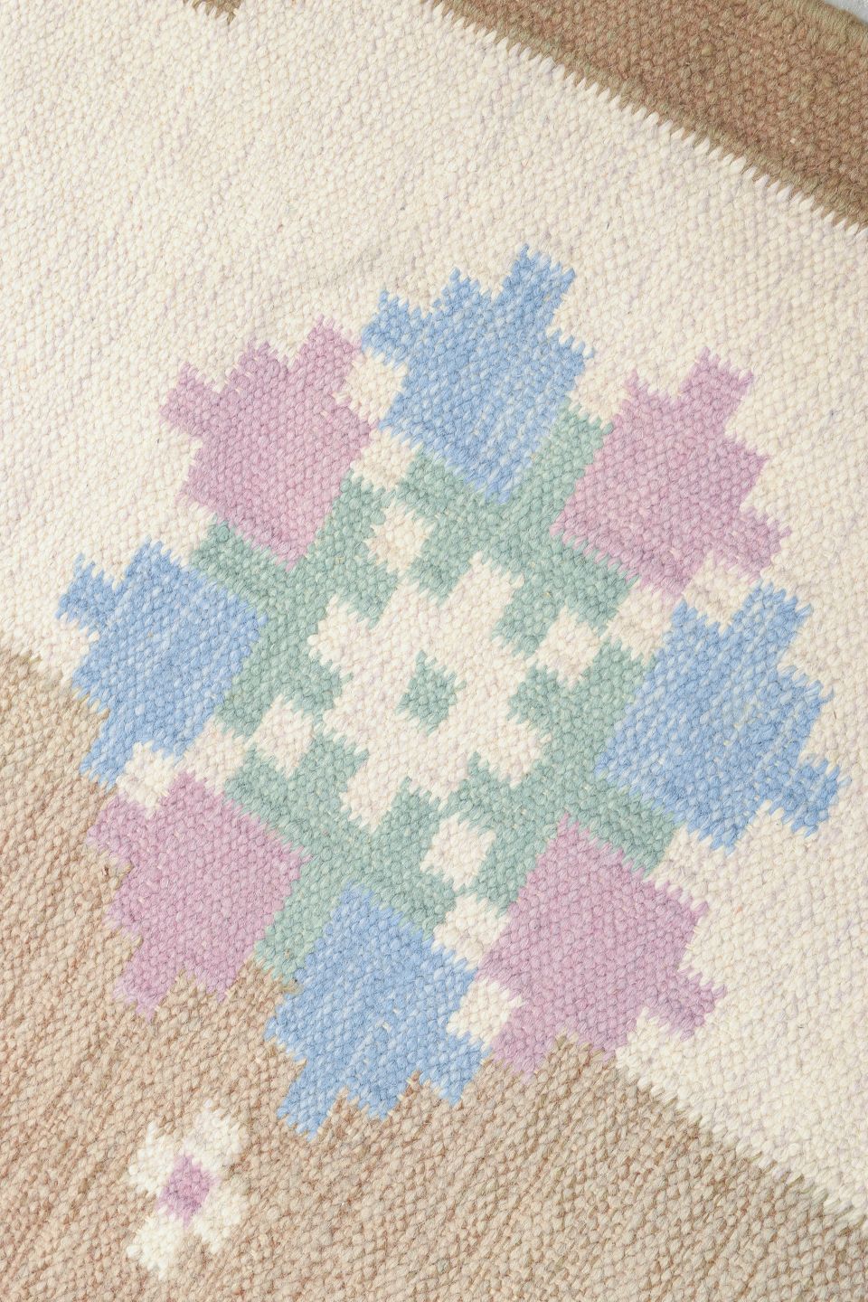 Håndvævet tæppe i klassisk svensk rölakan-teknik med geometrisk mønster i afdæmpede nuancer af beige, blå, grøn og rosa. Et smukt eksempel på svensk tekstilkunst fra 1960’erne med fokus på håndværk og tradition.