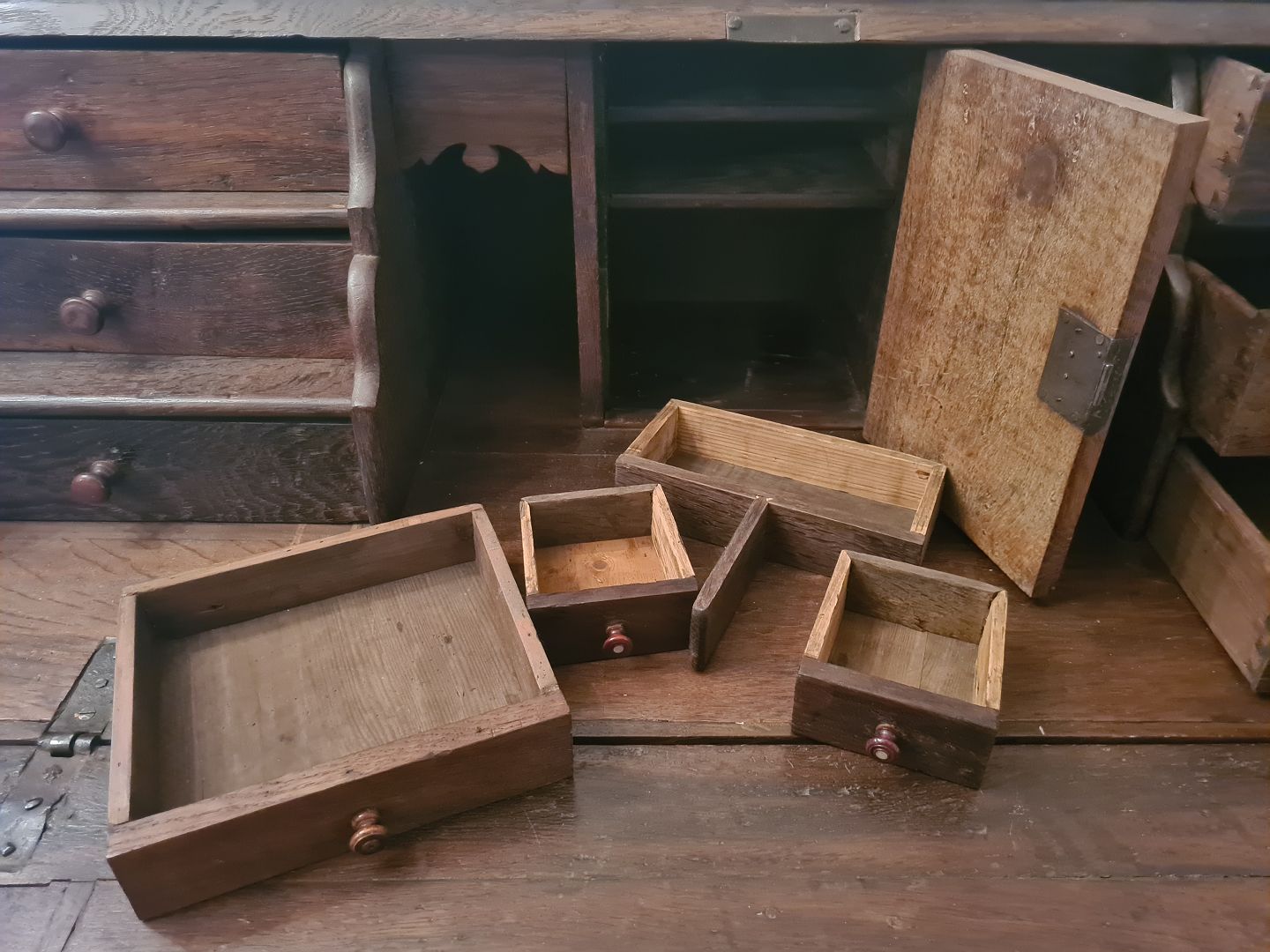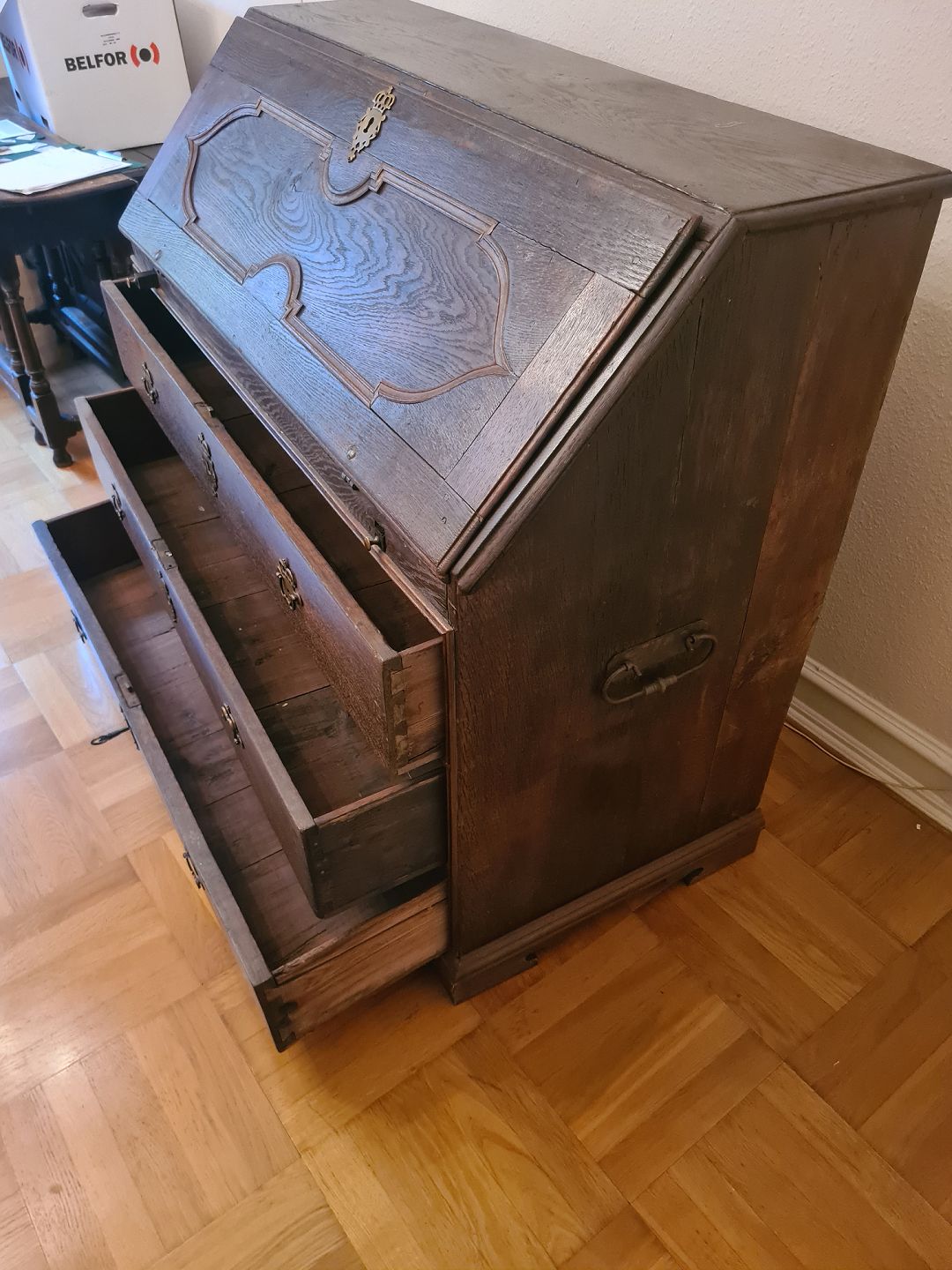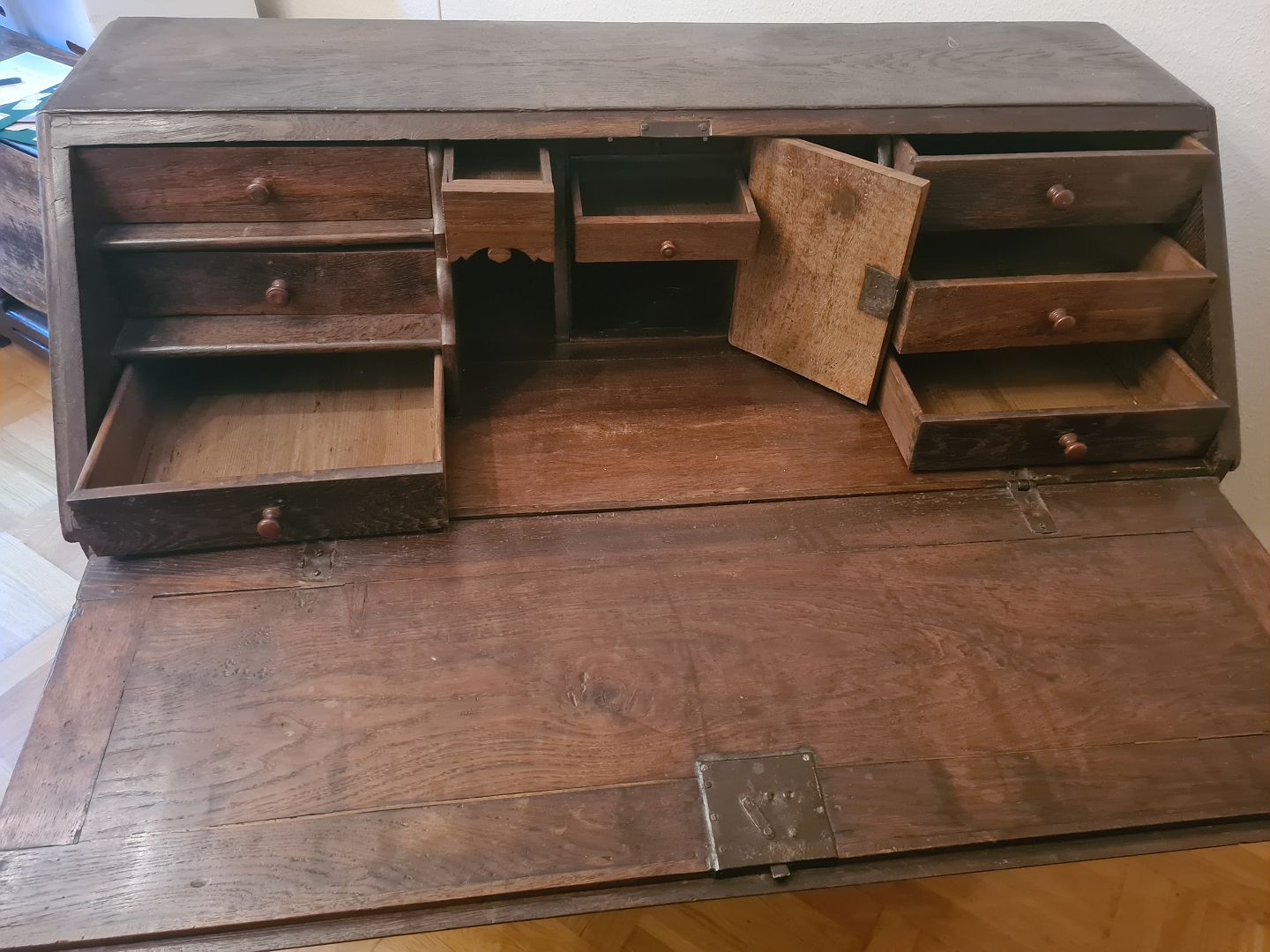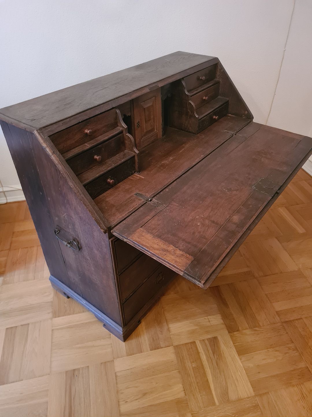 Chatol fra 1800 tallet i eg og med hemmelige skuffer. Fremstår pænt, funktionsdygtigt og velholdt. Højde 109 cm. Bredde 130 cm. Dybde 59 cm.