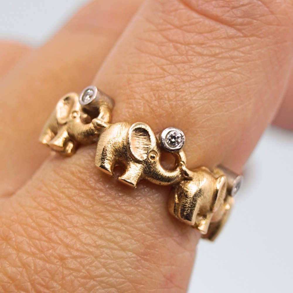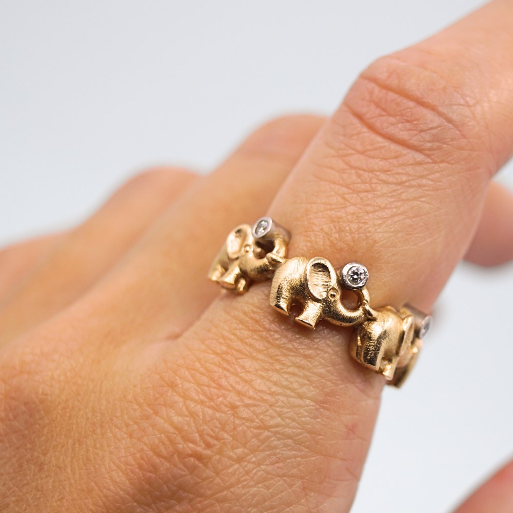 Ole Lynggaard guld smykke.Ole Lynggaard elefantring af 14 kt. guld. Med seks diamanter sat i hvidguld, i alt 0.12 ct.
