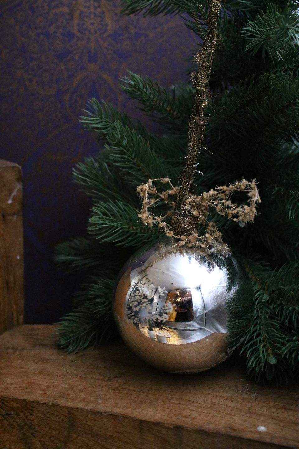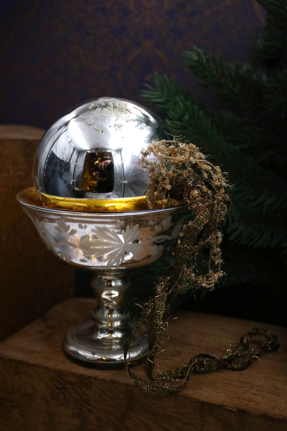 Svensk 1800 tals stor julekugle i fattigmandssølv med rest af bemalet blomster. Dia.: 12cm...