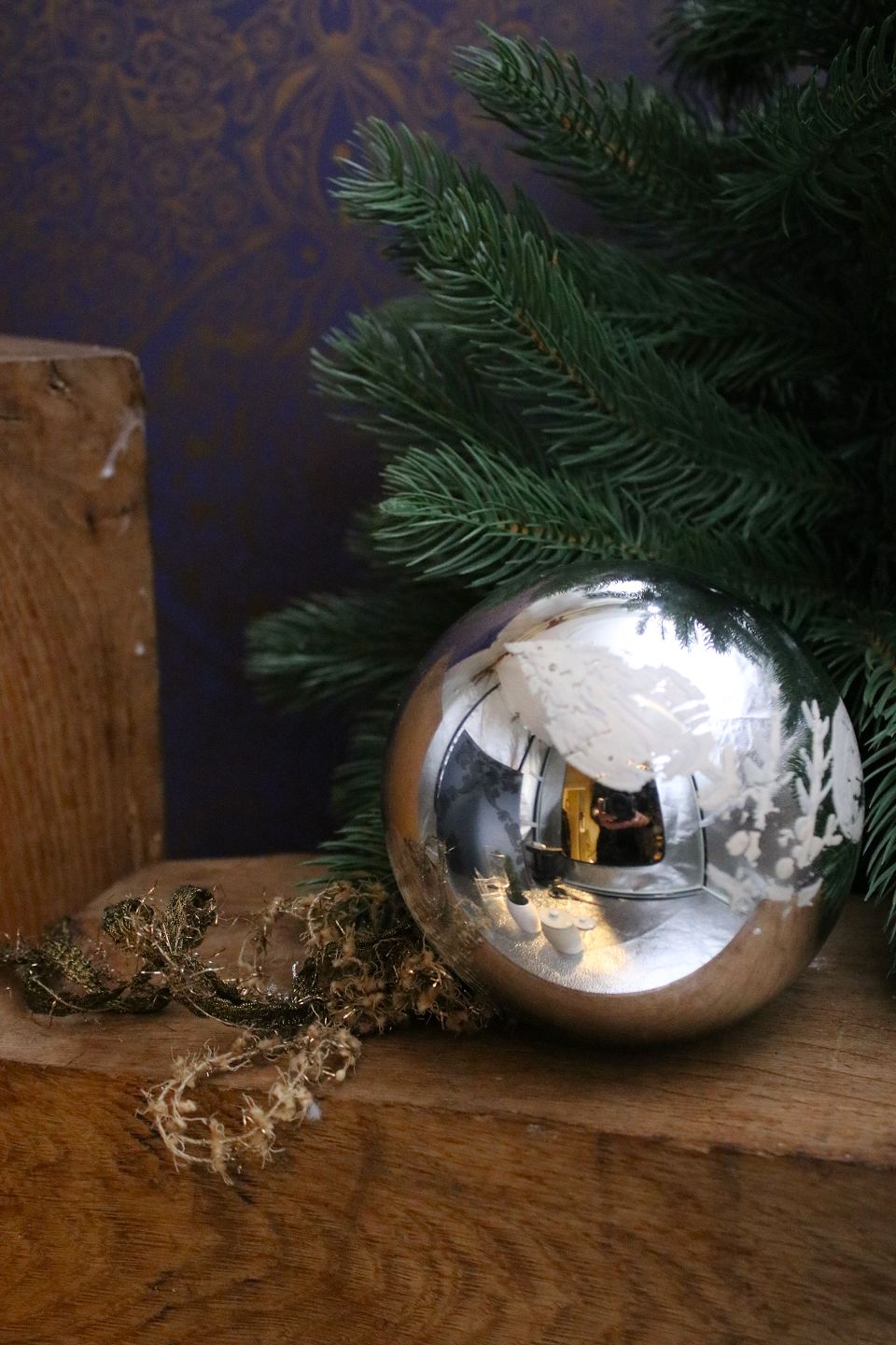 Svensk 1800 tals stor julekugle i fattigmandssølv med rest af bemalet blomster. Dia.: 12cm. Kuglen kan hænge , eller blot ligge til pynt.Emne nummer: Jul nr. 649