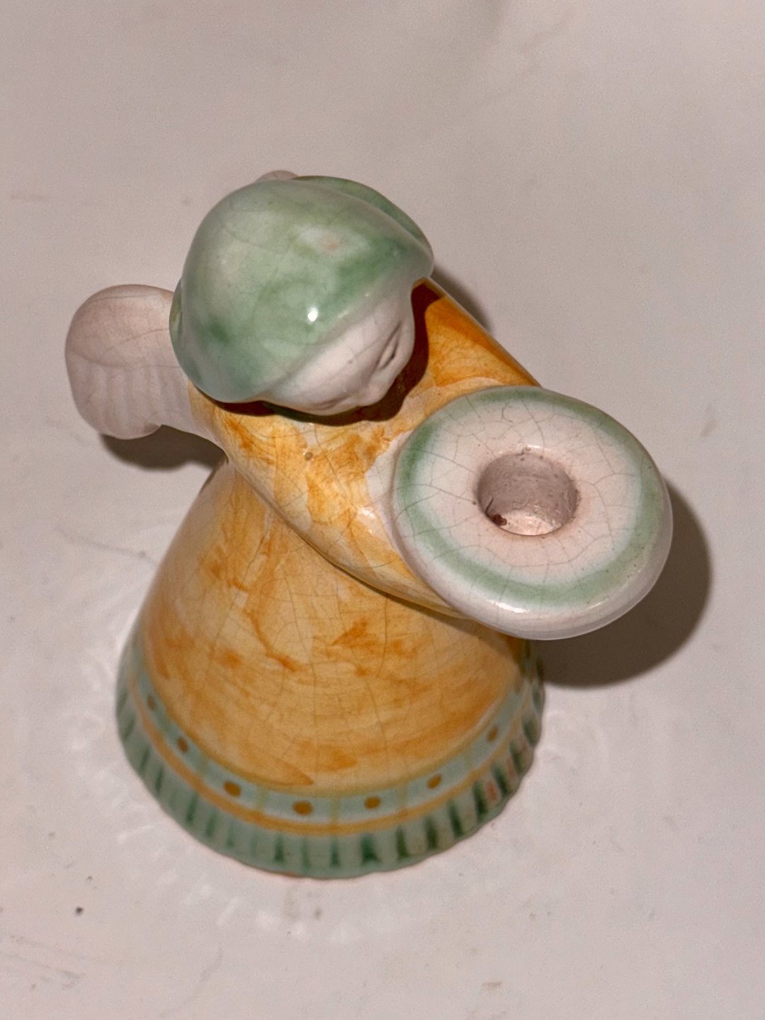 ENGEL I GUL KJOLE: Figur af bemalet engel i keramik som lyseholder fra den bornholmske lervarefabrik Lauritz Hjorth. Englen er iført gul kjole. Fremstår i god stand. Fabriksmærket på bunden. H. 10 cm