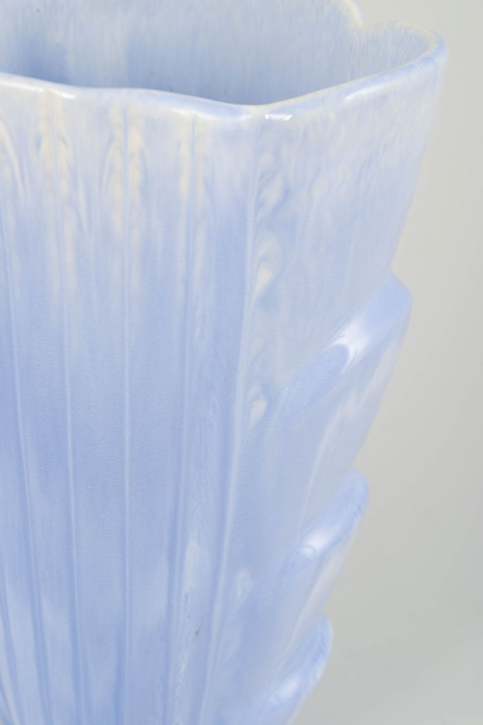 Imponerende keramisk vase med skulpturel, organisk form og lyseblå glasur med perlemorsskær. Et elegant eksempel på Rörstrands midt-århundredes formsprog. Stemplet som 2. sortering.
