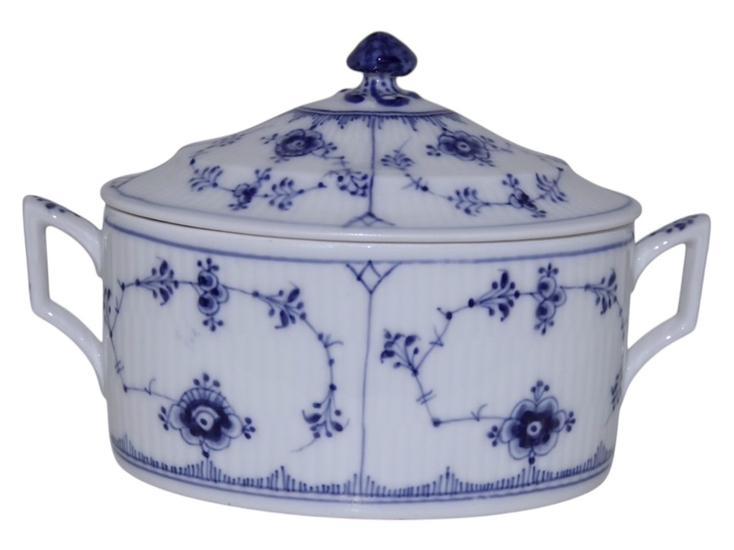 Royal Copenhagen Musselmalet Riflet, sjælden oval sukkerskål med låg.