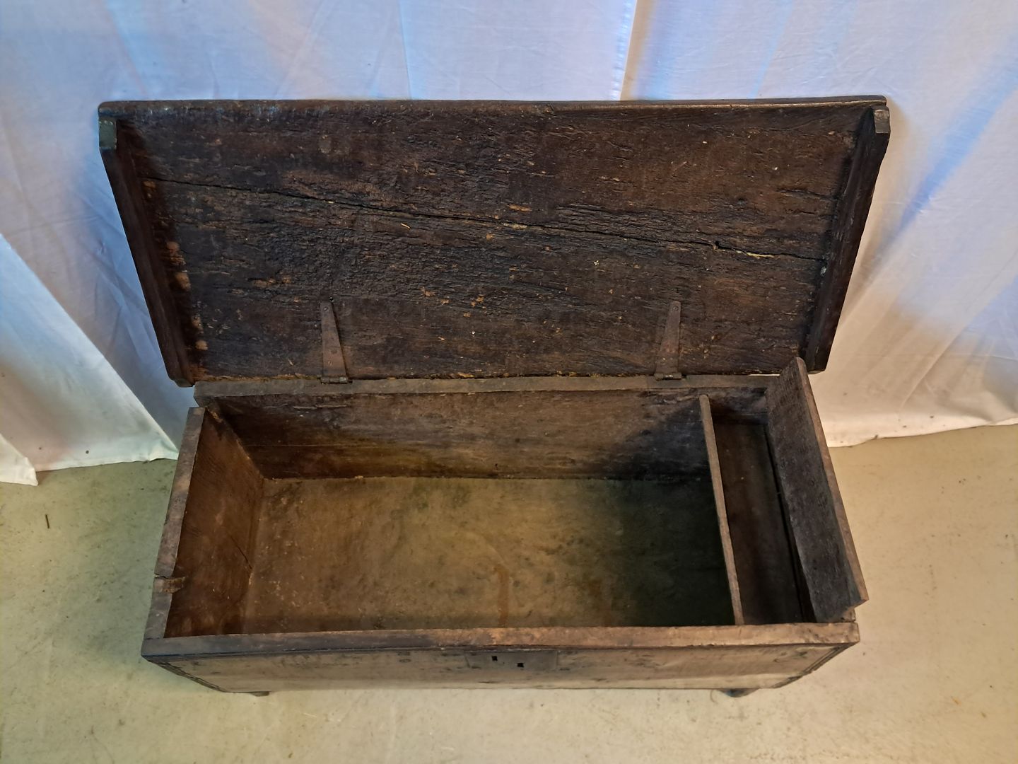 Kiste i massivt egetræ, fra 1850erne.Den har brugsspor, defekter og der medfølger ikke nøgle.