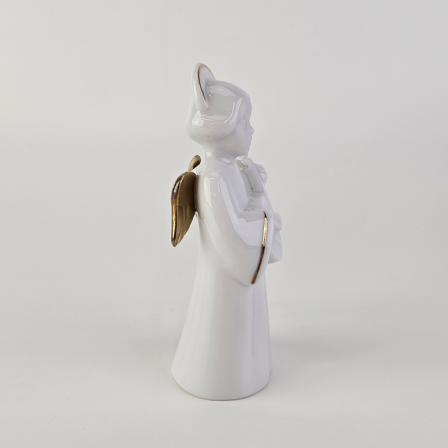 Figur med motiv af en engel som spiller på mandolin. Figuren er i hvidt porcelæn med forgyldte vinger og detaljer i 24 karat guld. 12 af 12 i serien Heavenly Music med titlen Mandolin