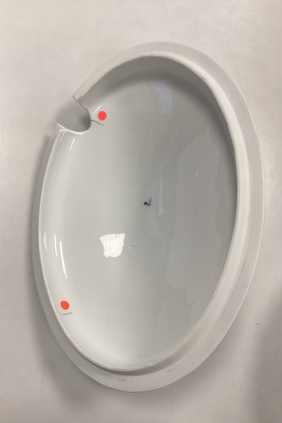 Royal Copenhagen Musselmalet Riflet oval terrin No. 2141. sortering. Har et afslag på det ene håndtag, samt skader fra brænding indvendig i terrinen og låget (se Billede)