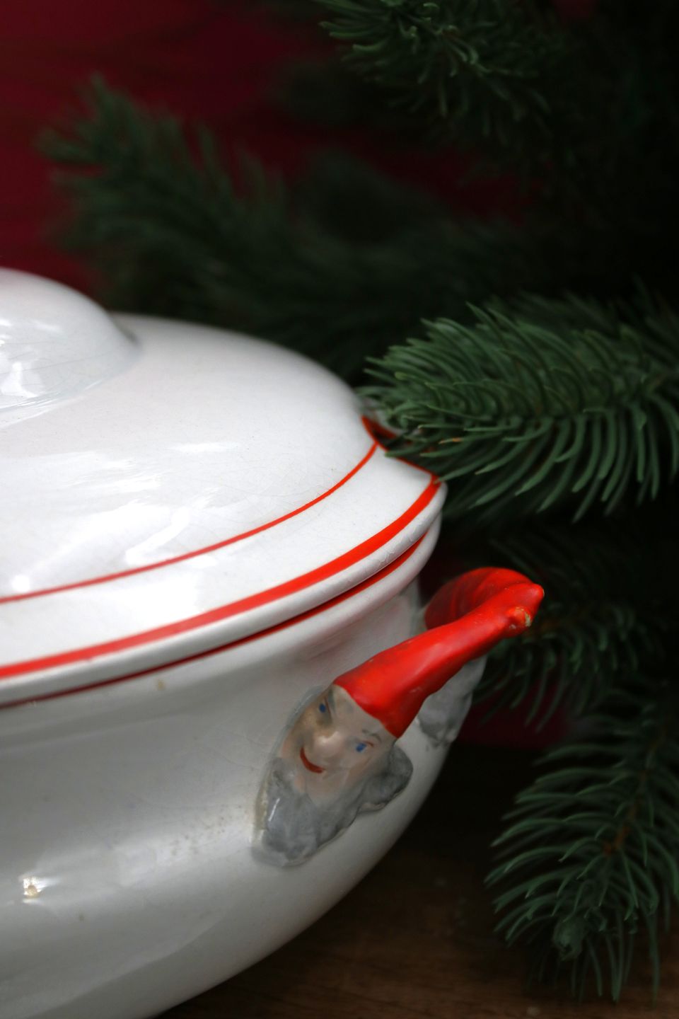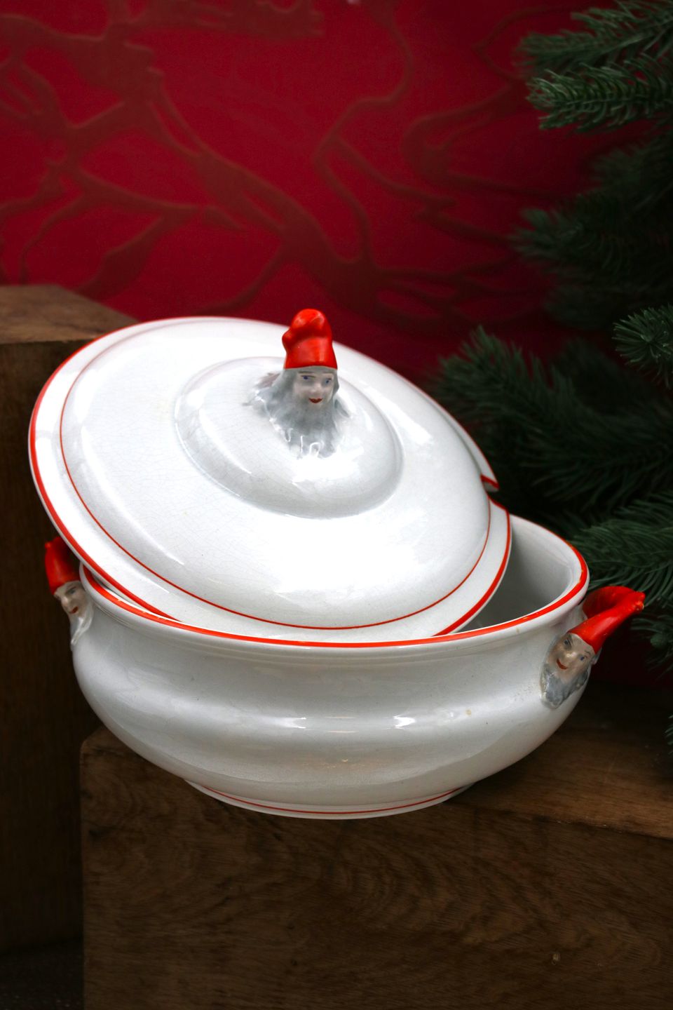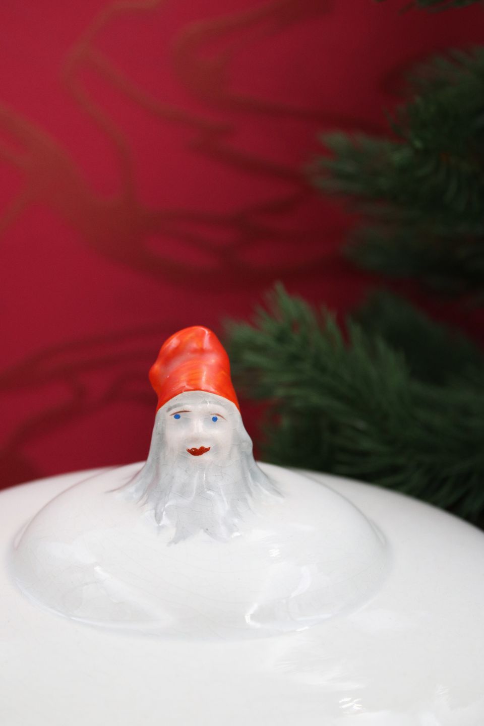 Gammel svensk Juleterrin i fajance med nisse på toppen af låget og på hankene...