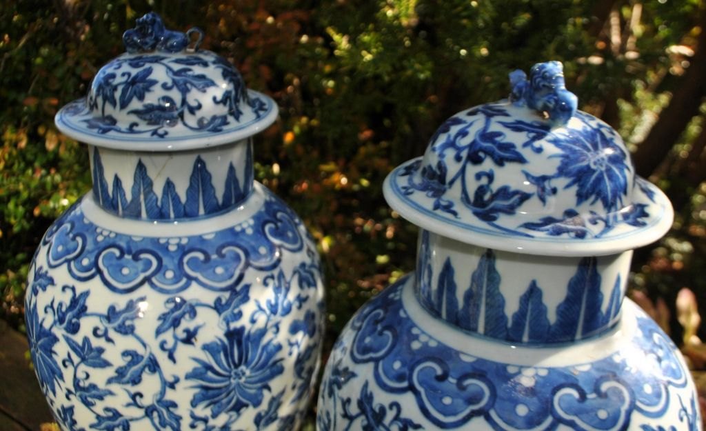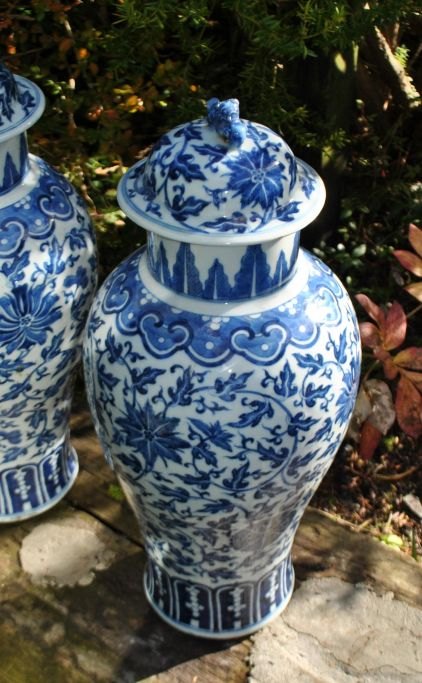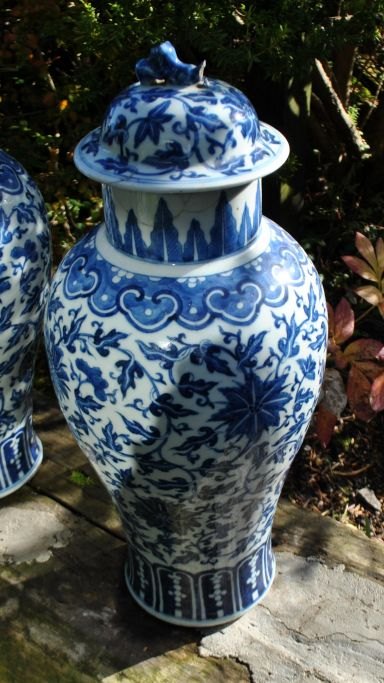 Paar chinesische Deckelkrüge, blau-weißes Porzellan, 19. Jahrhundert. Handgemaltes Dekor in Form von Blumen und Mustern. H: 46 cm.NB: Mit Mängeln. Beide Gläser sind am Deckel verklebt. Der Deckel ist mit dem Glas verklebt und die Gläser sind mit Sand gefüllt. Einem Löwen fehlt der Schwanz.