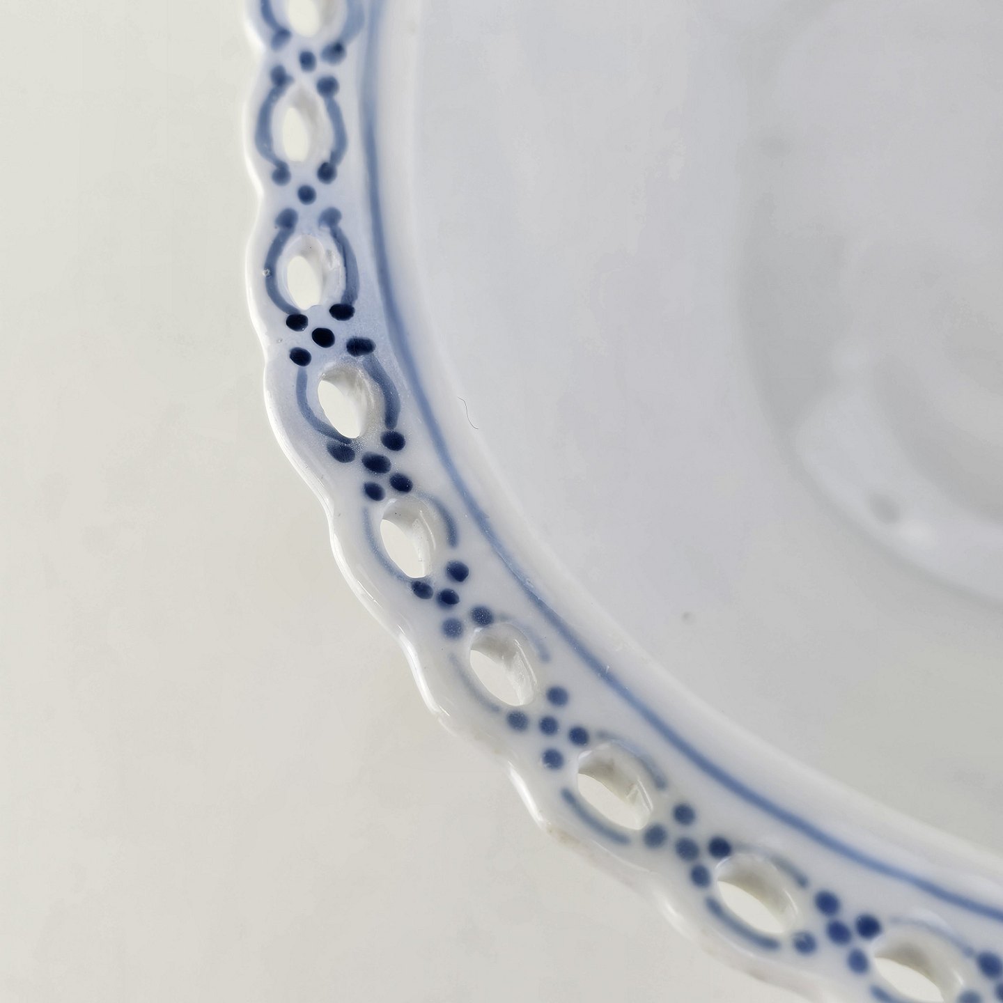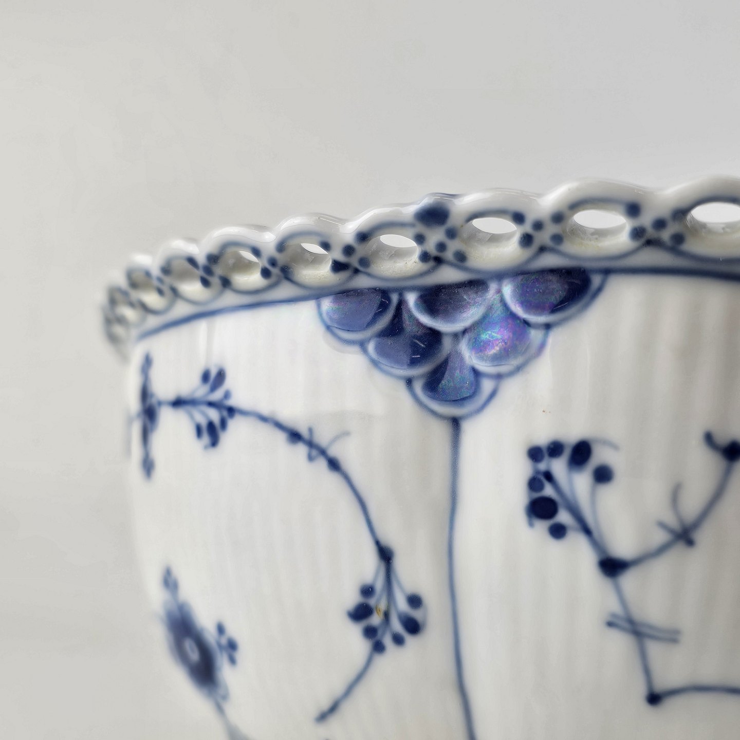 Stellet Musselmalet Helblonde er hvidt porcelæn dekoreret med blå blomster og mønstre. Øverst er porcelænet dekoreret med hulmønster.