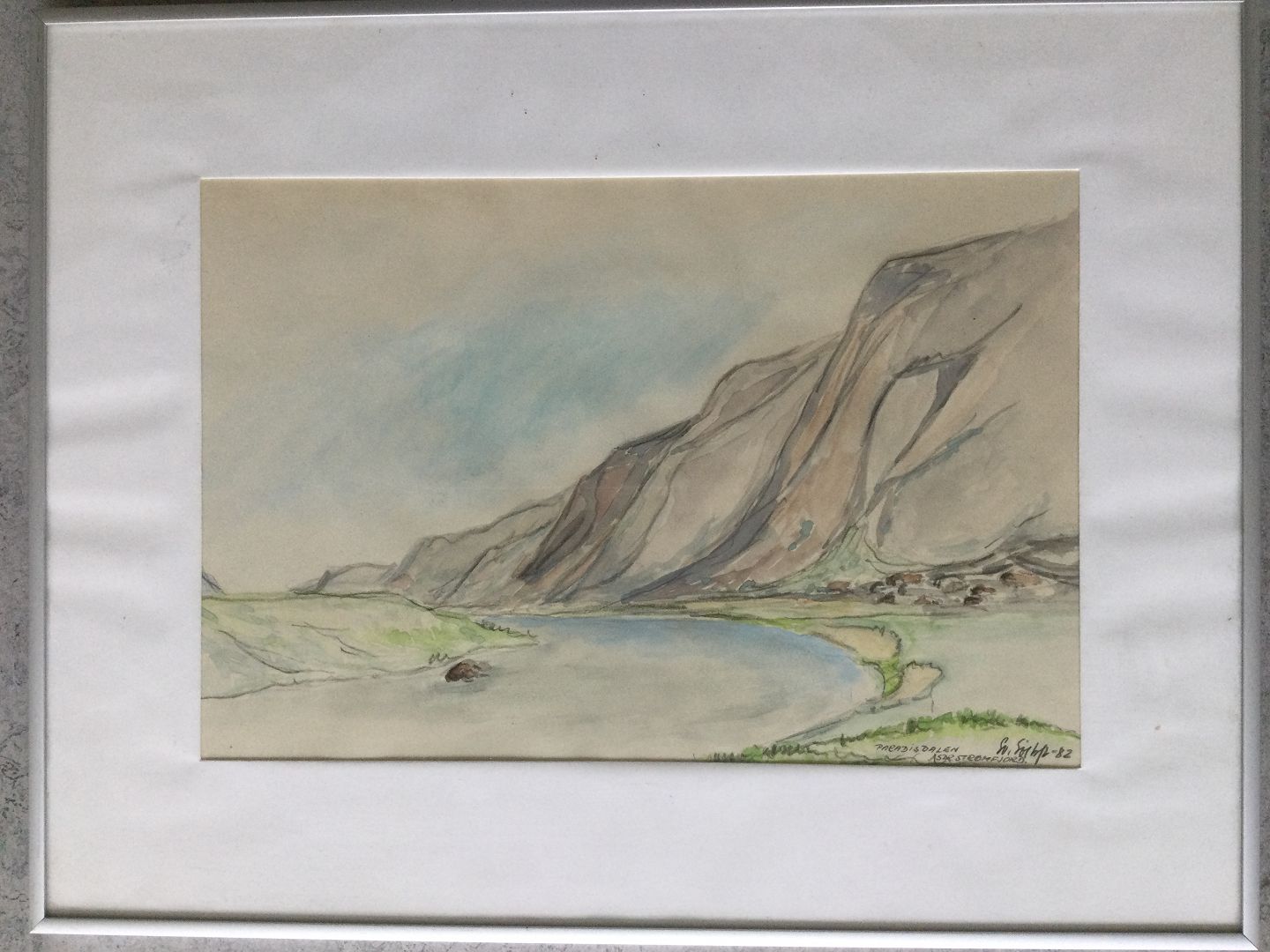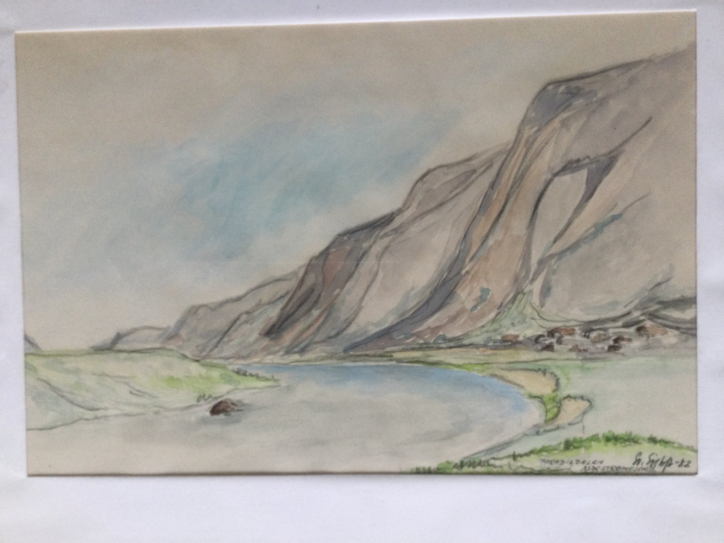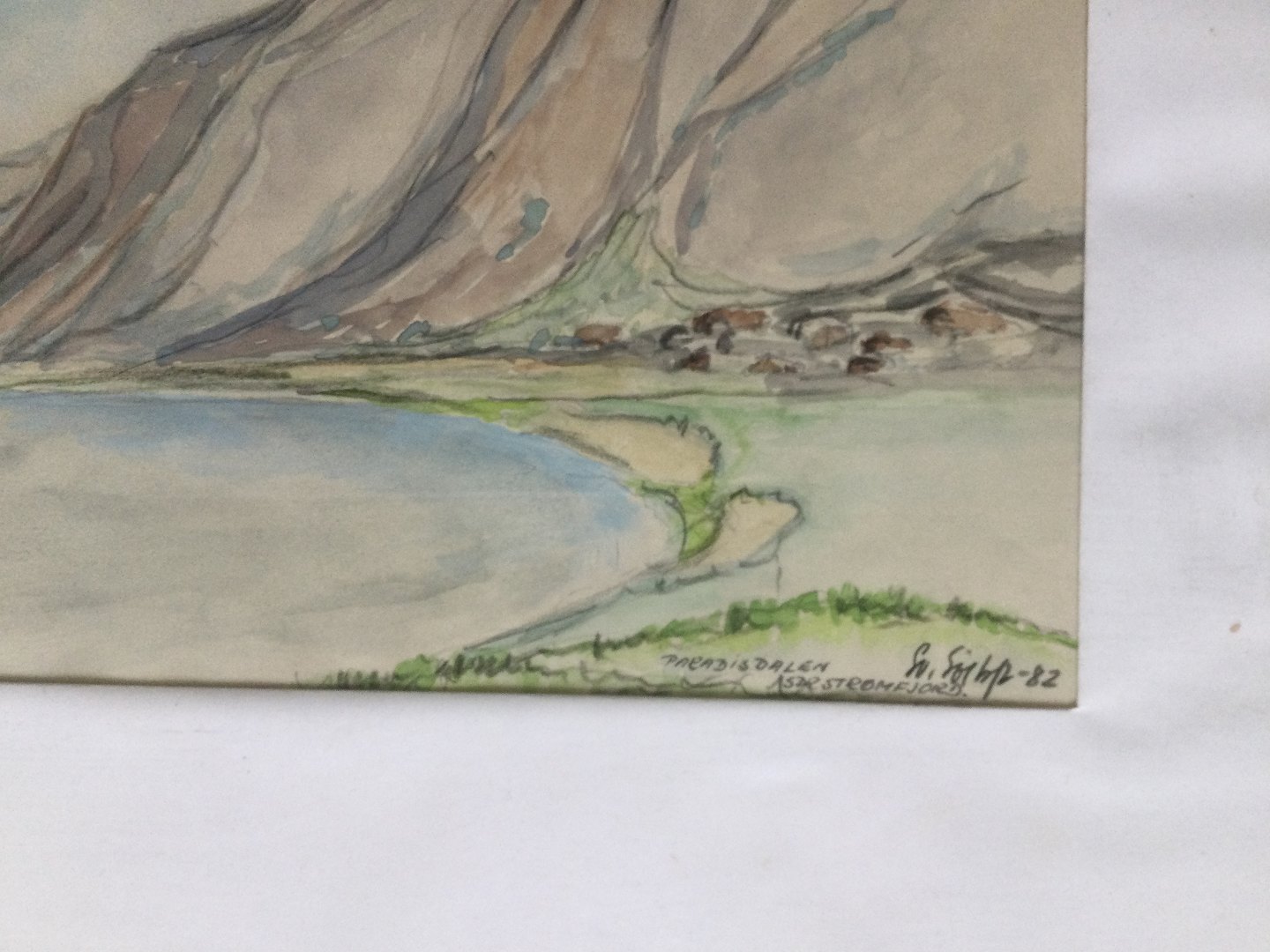 Akvarel af Svend Søltoft 1982 - Parti fra Paradisdalen, Store Strømfjord, Grønland.