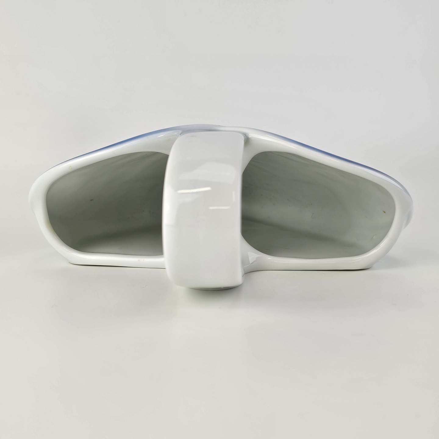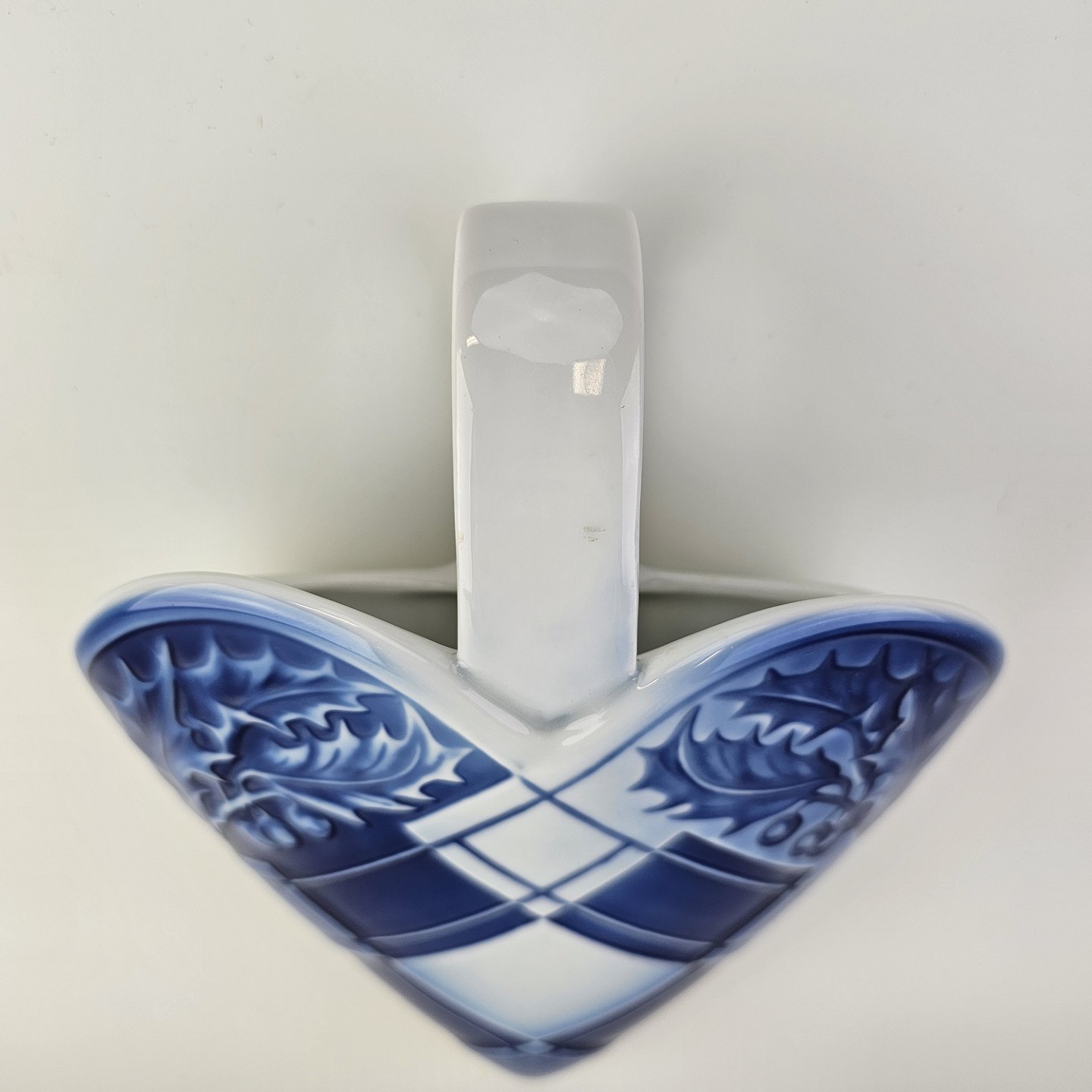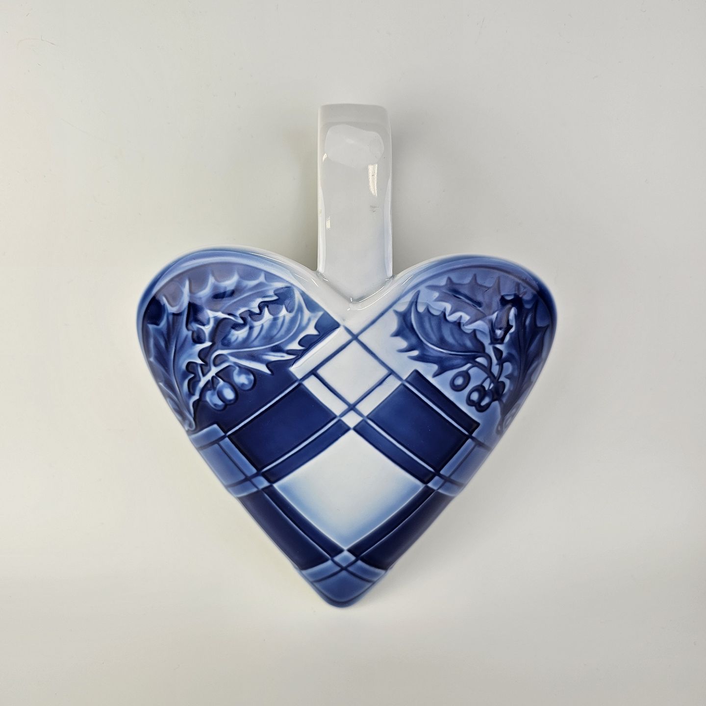 Flettet julehjerte til vægophæng i porcelæn i blå og hvide farver dekoreret med kristtjørn