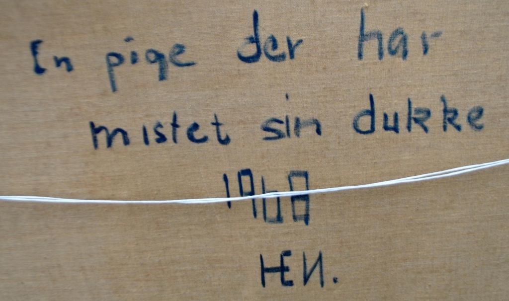 Dänische Künstlerin (20. Jahrhundert): Ein Mädchen, das seine Puppe verloren hat. Öl auf Leinwand. Rückseitiger Text und Monogramm 1968. 66 x 100 cm. Gerahmt: 85 x 120 cm. Als Geschenk an den Kunsthändler Hans Erik Nielsen, Aarhus. Vermutlich ein Werk von Kaj Christensen.Bestellnummer: 28539