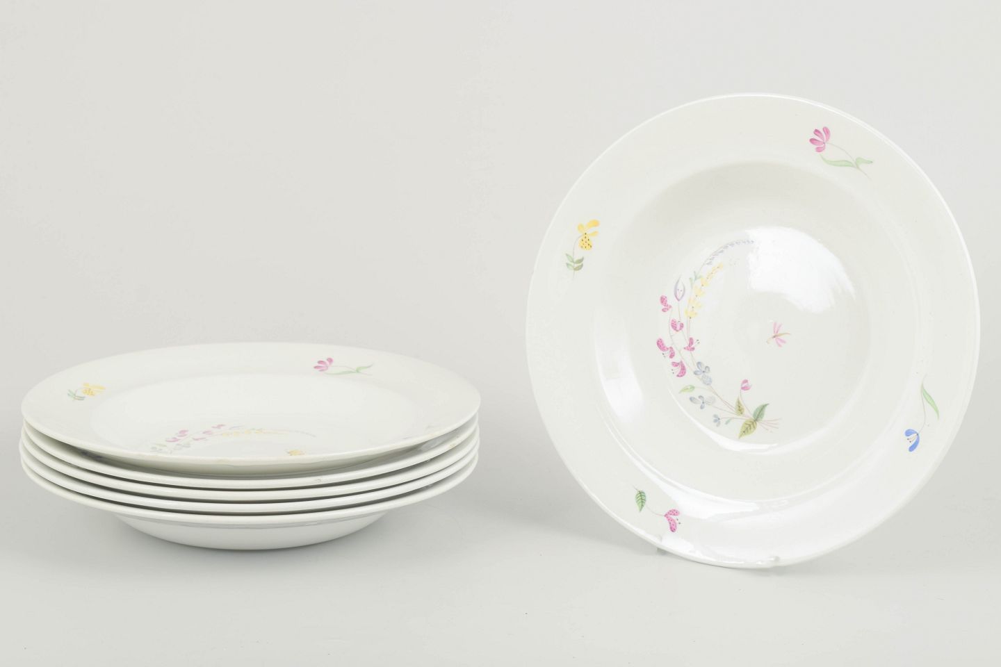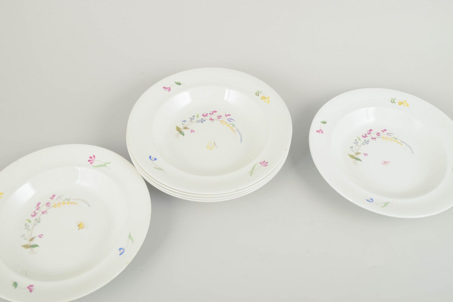 Sæt bestående af seks dybe tallerkener i hvid fajance med håndmalet blomsterdekoration i bløde pastelfarver, designet af Stig Lindberg for Gustavsberg. Serien udviser Lindbergs karakteristiske legende formsprog og delikate ornamentik, der forener funktionalitet med kunstnerisk udtryk.