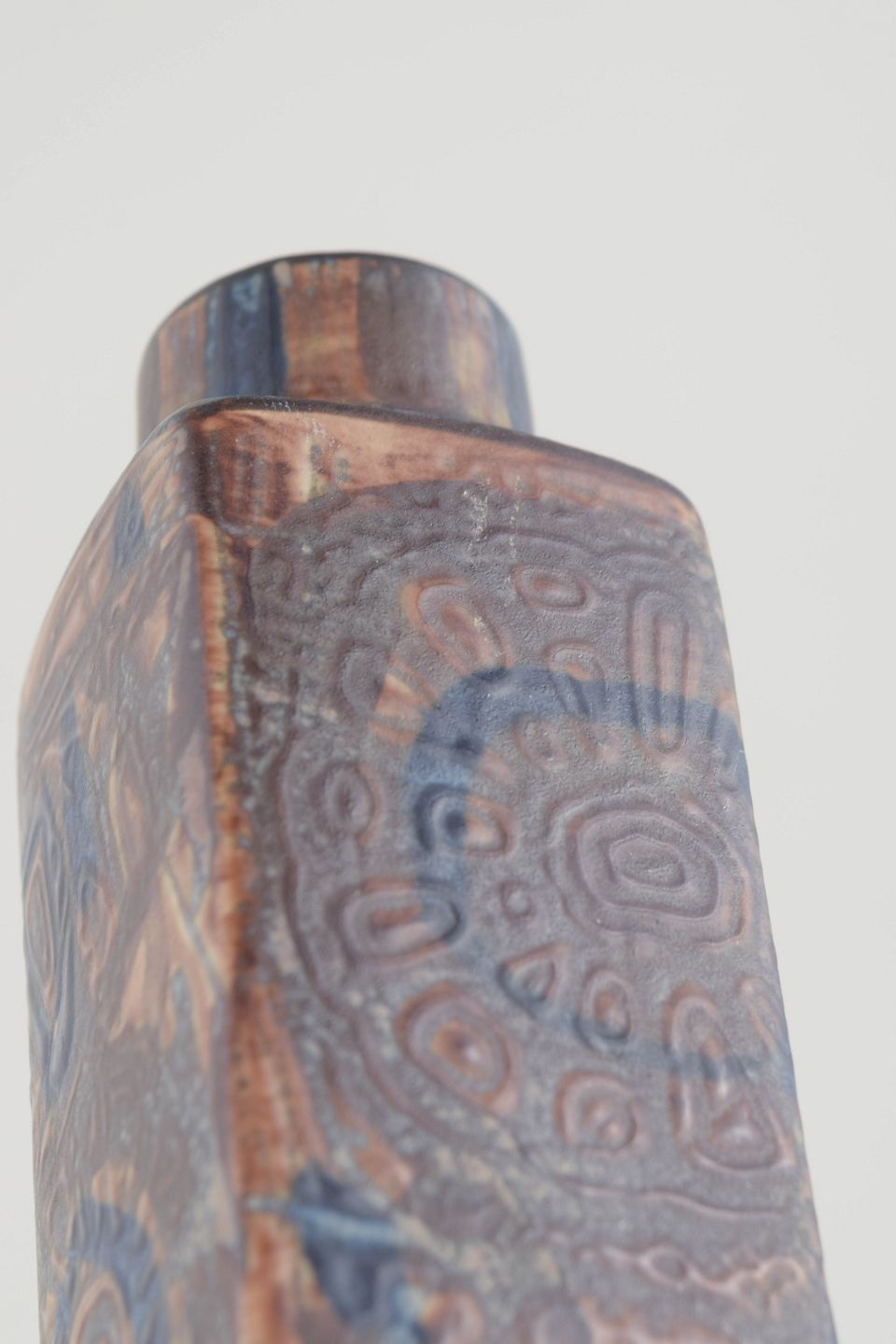 Rektangulær vase i stentøj med karakteristisk reliefdekoration i blå og brunlige nuancer fra Thorssons Baca-serie. Den geometriske form kombineret med det organiske mønster skaber et markant og tidstypisk udtryk for dansk design i perioden.