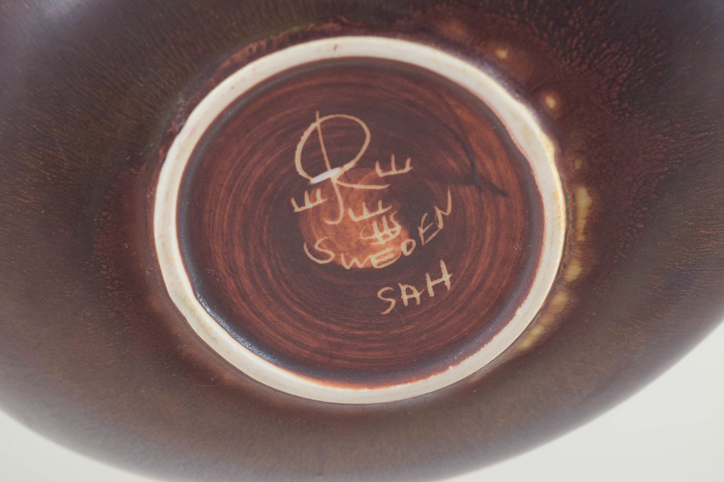 Asymmetrisk formet skål i stentøj med mat brunrød glasur med olivengrønne nuancer i midten og lys kant. Et fint eksempel på Stålhane’s sans for skulpturel balance og afdæmpet farvespil.