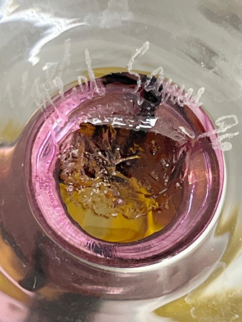 Håndlavede snapseglas i mundblæst glas med levende farvespil i orange, rosa, gule og blå nuancer. Hvert glas er unikt med lette variationer i form og dekoration, karakteristisk for eksperimenterende svensk kunstglas fra perioden.