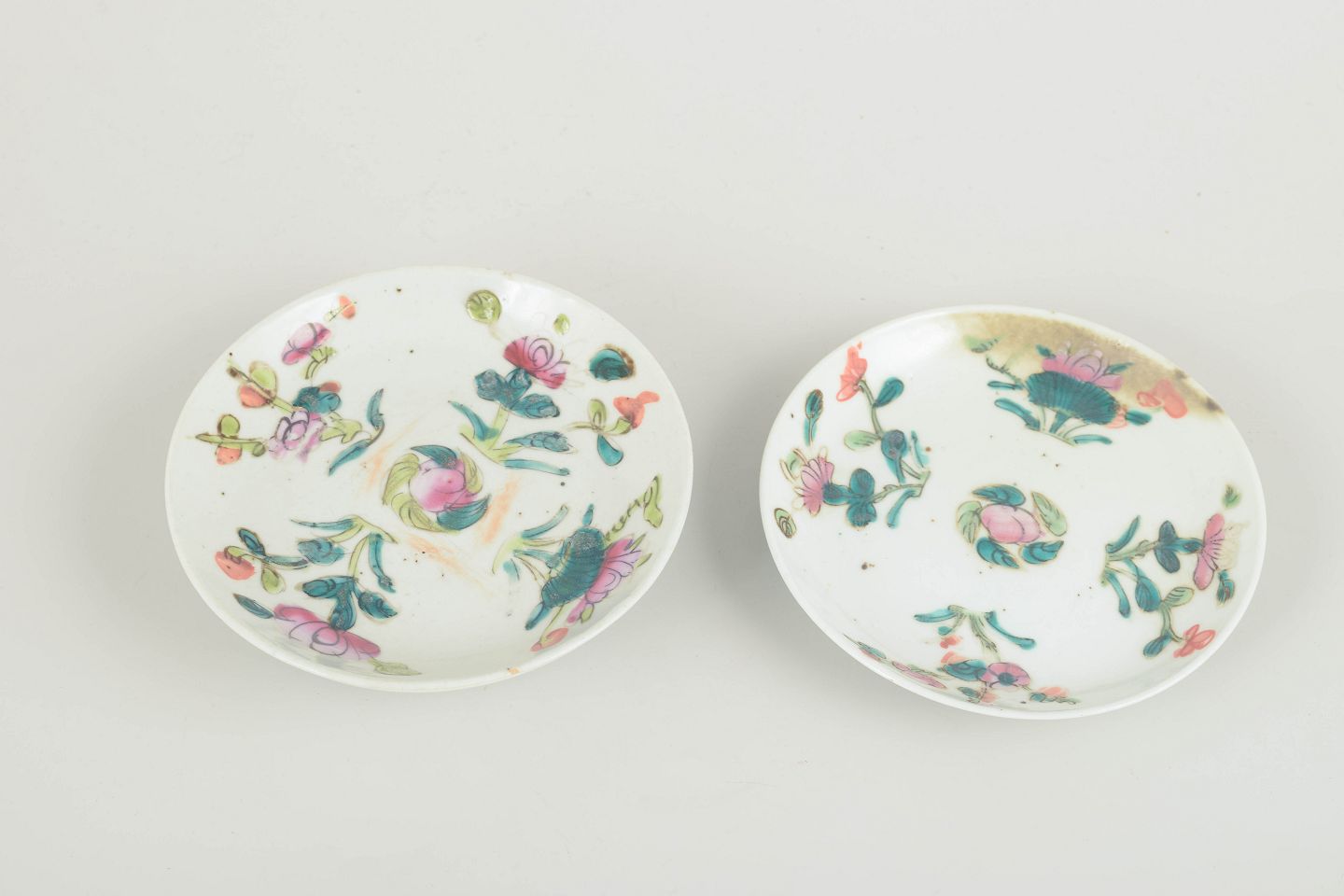 Kinesiske porcelænstallerkener, 1800-tallet.Tre små tallerkener i hvidt porcelæn dekoreret i famille rose-paletten med håndmalede blomster og bladmotiver i rosa, grønne og turkise nuancer. Typisk for Qing-dynastiets dekorative stil med levende farver og delikate penselstrøg.