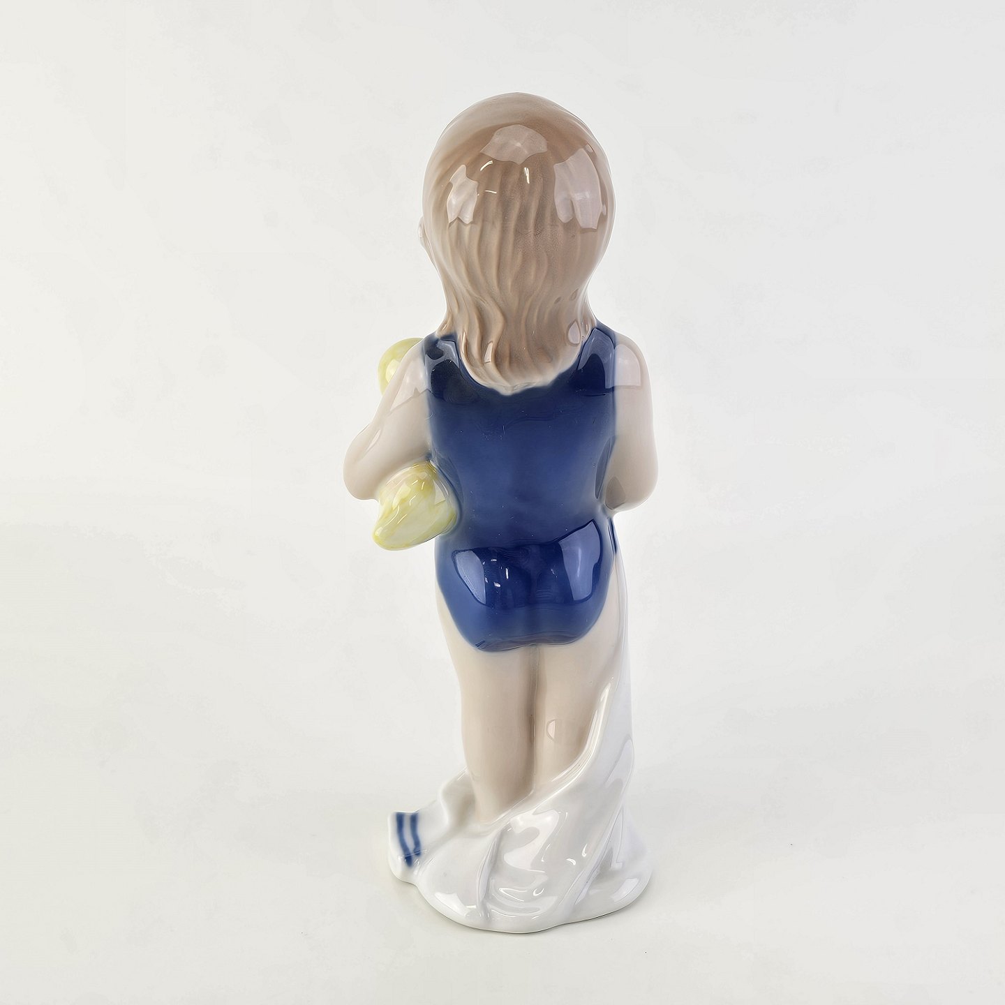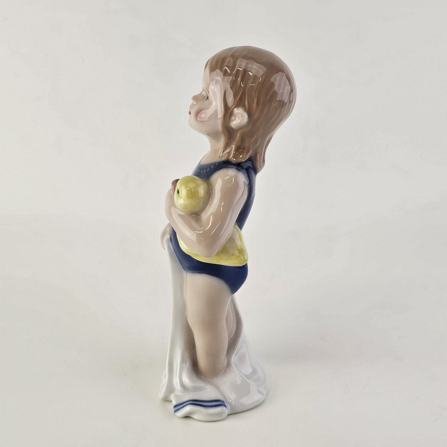 Figur i kongeligt porcelæn med form af en lille pige i en blå badedragt med et håndklæde og en badeandNr. 678