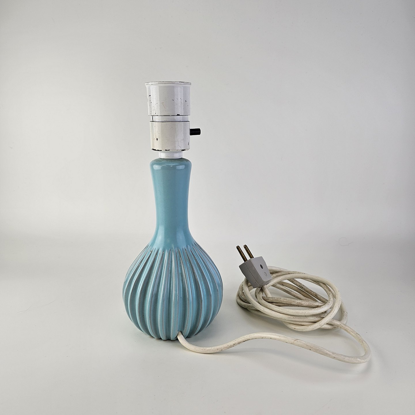 Rund bordlampe i rillet grønblå keramik med hvid fatningProducent Eslau