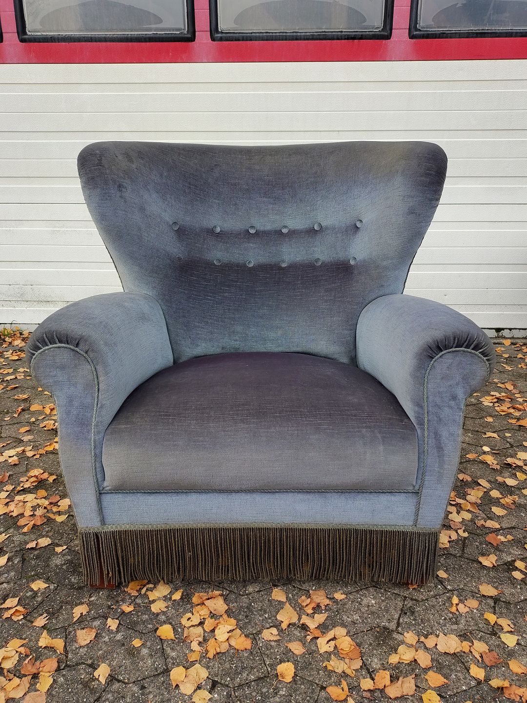 Lænestol med velourbetræk, fra 1930erne.Den har brugsspor.