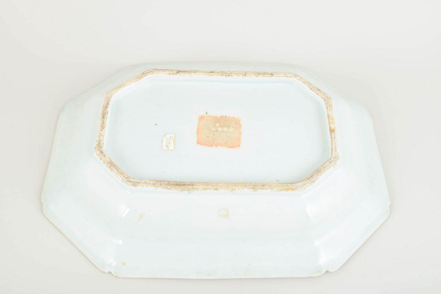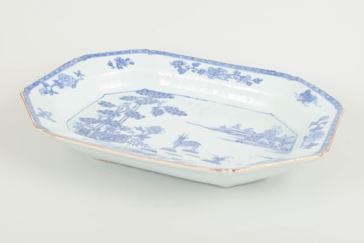Håndmalet porcelænsfad i ottekantet form med klassisk blå-hvid dekoration. Motivet viser landskab med hjort, træer og pavillon, omgivet af blomsterbort langs kanten.