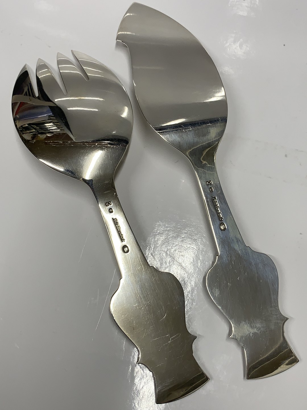 Fiskeserveringssæt med Delfiner i sølv Carl M. Cohr Længde 22,5 og 25,5 cm