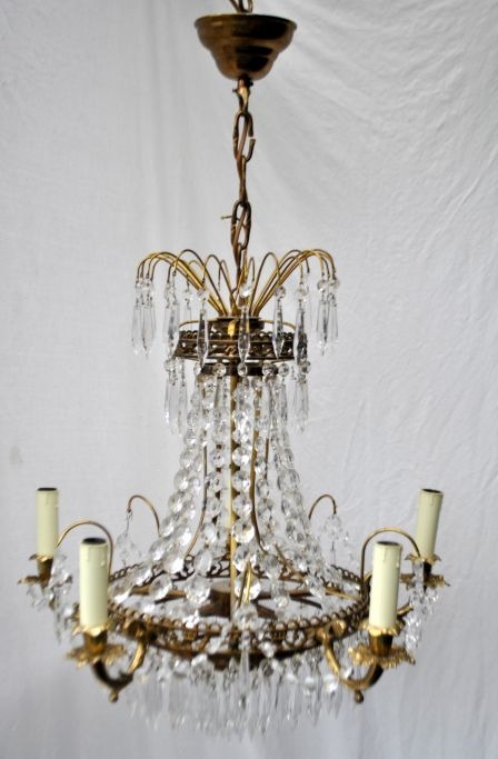 Prismenleuchter, 20. Jahrhundert. Aus Messing, verziert mit Blättern und Girlanden. Für 5 elektrische Kerzen. Anzahl der Prismen: 508 Stück. Höhe: 75 cm. Durchmesser: 53 cm.Bestellnummer: 28542