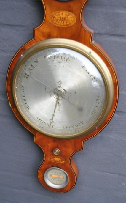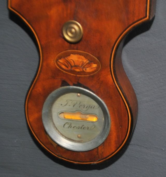 Englisches Radbarometer. 19. Jahrhundert. J. Verga Chester. Stil Georg III. Mahagonigehäuse mit Intarsien. Signiert. Länge: 110 cm. Durchmesser: 31 cm.Bestellnummer: 28544
