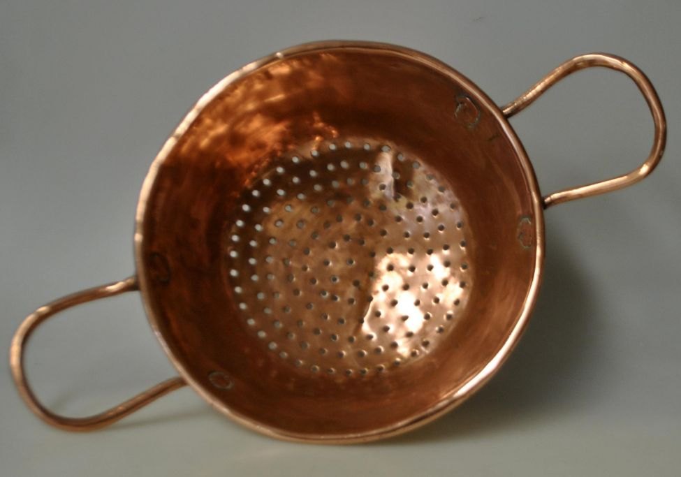 Kupfersieb, 19. Jahrhundert. Dänemark. Ohne Stempel. L: 35 cm. H: 9 cm. Durchmesser: 21 cm.Herkunft: Die inzwischen geschlossene Schwanenapotheke in Randers.