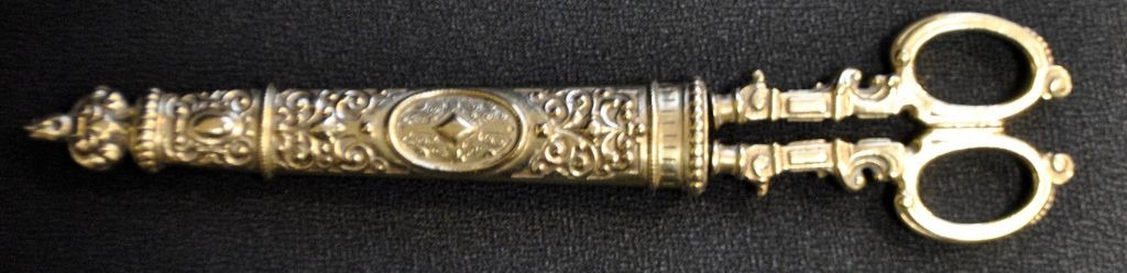 Messingschere in verzierter Messingscheide, 1880. L. 26,5 cm.Bestellnummer: 28571